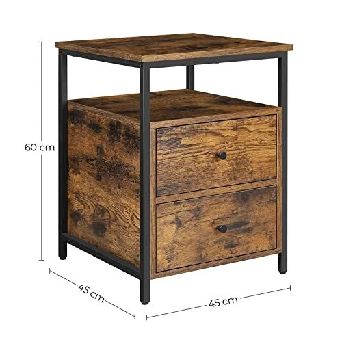 Maak kennis met het nachtkastje uit de VINCYER Collectie – een stijlvolle en functionele aanvulling voor elke woon- of slaapkamer. Met zijn afmetingen van 45 x 45 x 60 cm is dit nachtkastje met open schappen voorzien van 2 lades, waardoor er voldoende opbergruimte is voor je benodigdheden. Met zijn rustieke bruine en zwarte kleurstelling voegt dit nachtkastje een vleugje charme in industriële stijl toe aan je ruimte.Een van de belangrijkste kenmerken van dit nachtkastje is zijn stabiliteit. Gemaakt met een mix van hoogwaardig spaanplaat en robuuste stalen buizen, zorgt het frame van het nachtkastje voor een langdurige duurzaamheid. De verstelbare poten zorgen ervoor dat de tafel stevig staat, zelfs op oneffen vloeren, wat zorgt voor extra stabiliteit en gemoedsrust.Een ander opvallend kenmerk van dit nachtkastje is de soepele en stille ladegeleiders. Geen luide en vervelende geluiden meer als je midden in de nacht iets zoekt. De lades gaan moeiteloos open, zodat je kunt vinden wat je nodig hebt zonder je wederhelft te storen. Bovendien maakt de ruimte tussen de basis van de bijzettafel en de vloer je dagelijkse schoonmaakroutine een fluitje van een cent. Je hoeft niet meer te worstelen om bij de moeilijk schoon te maken plekken te komen. Met dit nachtkastje is het nog nooit zo makkelijk geweest om een schone en opgeruimde ruimte te behouden. Montage is een fluitje van een cent met het nachtkastje uit de VINCYER Collection. Zeg maar dag tegen ingewikkelde instructies en frustrerende montageprocessen. Deze tafel heeft een eenvoudige constructie, genummerde onderdelen en geïllustreerde instructies. Je nieuwe nachtkastje staat in een mum van tijd, zonder gedoe.Specificaties:- Kleur: Rustiek Bruin, Zwart- Materiaal: Spaanplaat, Staal- Afmetingen van het product: 45 x 45 x 60 cm (L x B x H)- Gewicht van het product: 16 kg- Max. Totale statische belasting: 40 kgInbegrepen in het pakket zijn:- 1 x Nachtkastje- 1 x Accessoire Kit- 1 x Anti-Tip Kit- 1 x Instructies (beschikbaar in meerdere talen: Engels, Spaans, Duits, Frans, Italiaans)Laat de hoek van je kamer niet verloren gaan. Verhoog je ruimte met het Nachtkastje Nachtkastje uit de VINCYER Collectie. Met zijn ontwerp in industriële stijl en praktische functies zal dit nachtkastje niet alleen de esthetiek van je kamer verbeteren, maar je ook de opslag en stabiliteit bieden die je nodig hebt. Mis het niet om wat meer stijl en gemak aan je woonruimte toe te voegen. Bestel je nachtkastje vandaag nog!