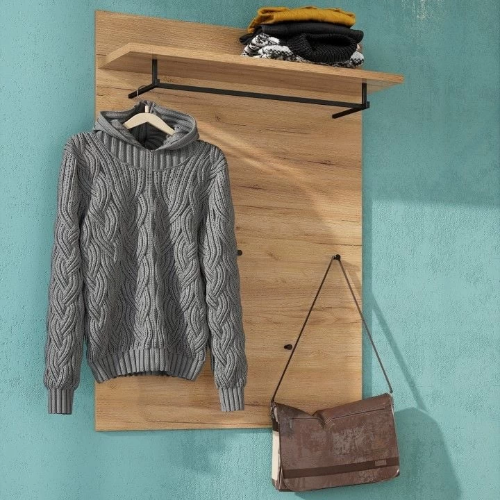 De Frodo-collectie van de Duitse meubelfabrikant Germania geeft een gezellige, warme uitstraling aan je inkomhal in eikdecor. Heldere vormen en een fijne parelstructuur geven de houten aanblik extra cachet. De kapstok is uitgerust met een legplank, een mooie metalen kledingstang en vijf jashaken.Â