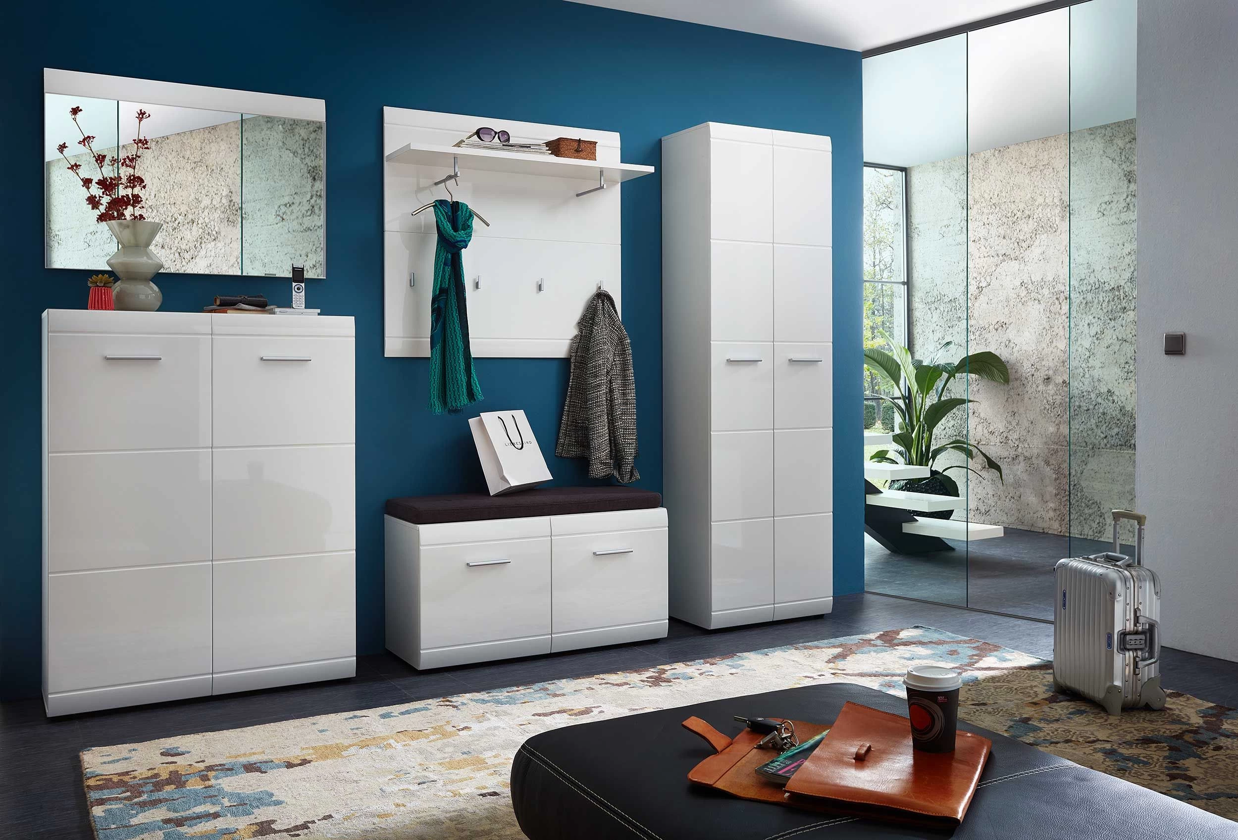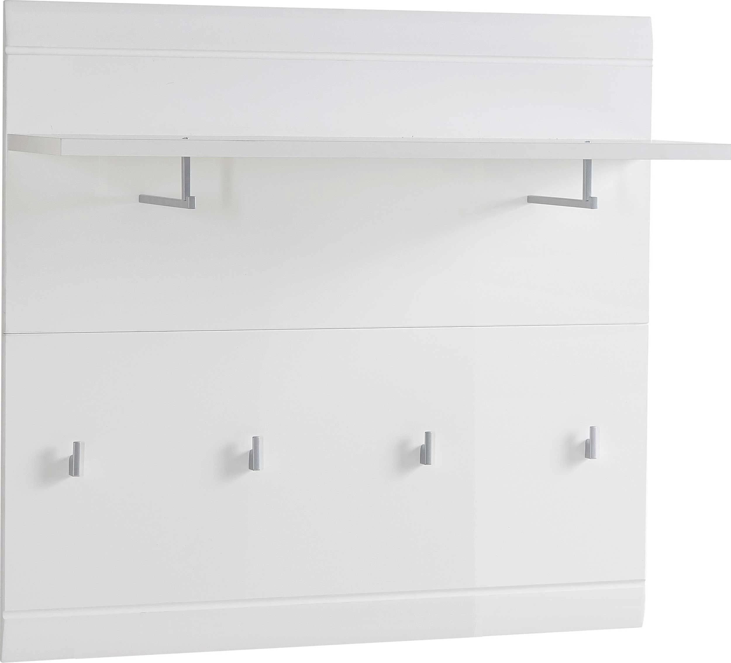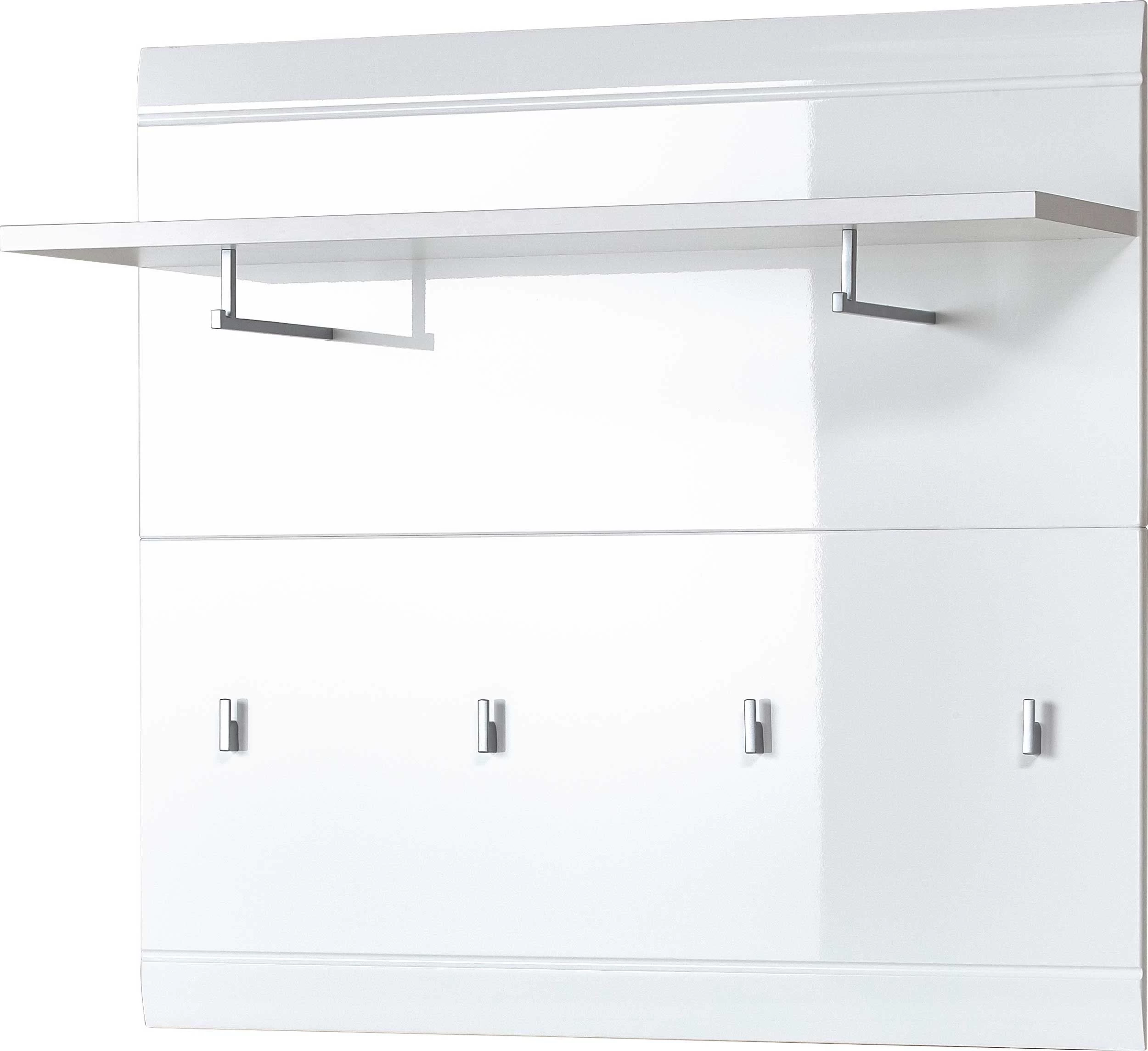 Kapstok Allan met 2 kledingstangen, legplank en 4 jashaken, gemaakt uit spaanplaat in wit. Fronten afgewerkt in hoogglanzende, thermogevormde MDF.Â