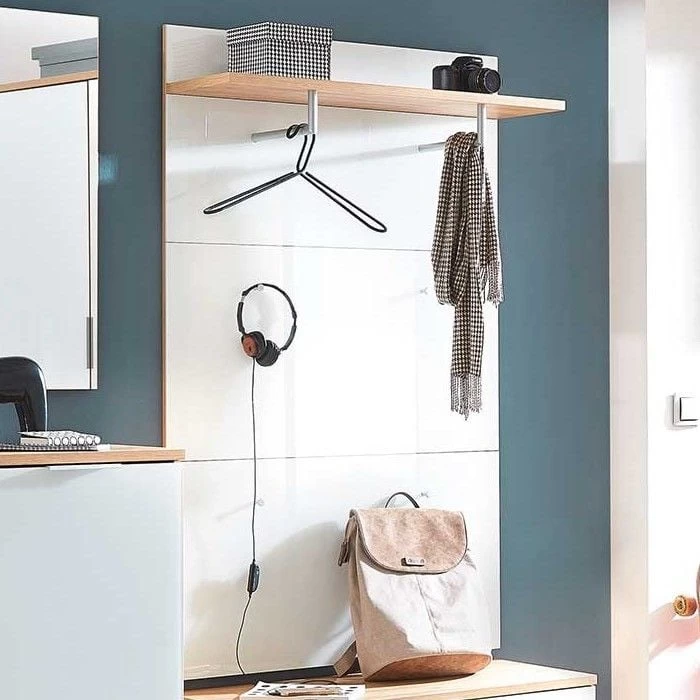 Kapstokpaneel Tille in eikdecor met witte glazen fronten, uitgerust met een hoedenplank, kledingstang en 4 jashaken. Meubel gemaakt uit spaanplaat en afgewerkt met een laagje melamine.
