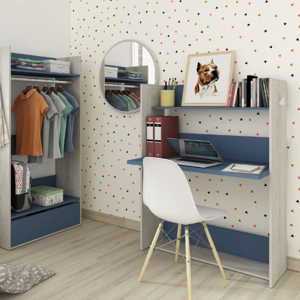 Kast met ingebouwd bureaublad. Gemaakt uit spaanplaat en afgewerkt met een melaminelaag. Met blauwe accenten. 100x52x130 cm.
