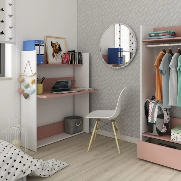 Met de producten uit de Bo-collectie stel je binnen no-time een volledige slaapkamer samen. Een bed uit de Bo9- of de Bo12-collectie, een nachtkastje uit de Bo0-collectie en deze kast met bureaublad uit de Bo0-collectie, meer heb je niet nodig! Deze kast heeft 3 legplanken, waarvan de middelste dienstdoet als bureau. Hij is gemaakt van spaanplaat en afgewerkt met een melaminelaag. Hierdoor is deze kast makkelijk schoon te maken. Daarnaast is hij door de bijgeleverde montagefiche ook makkelijk zelf te monteren.