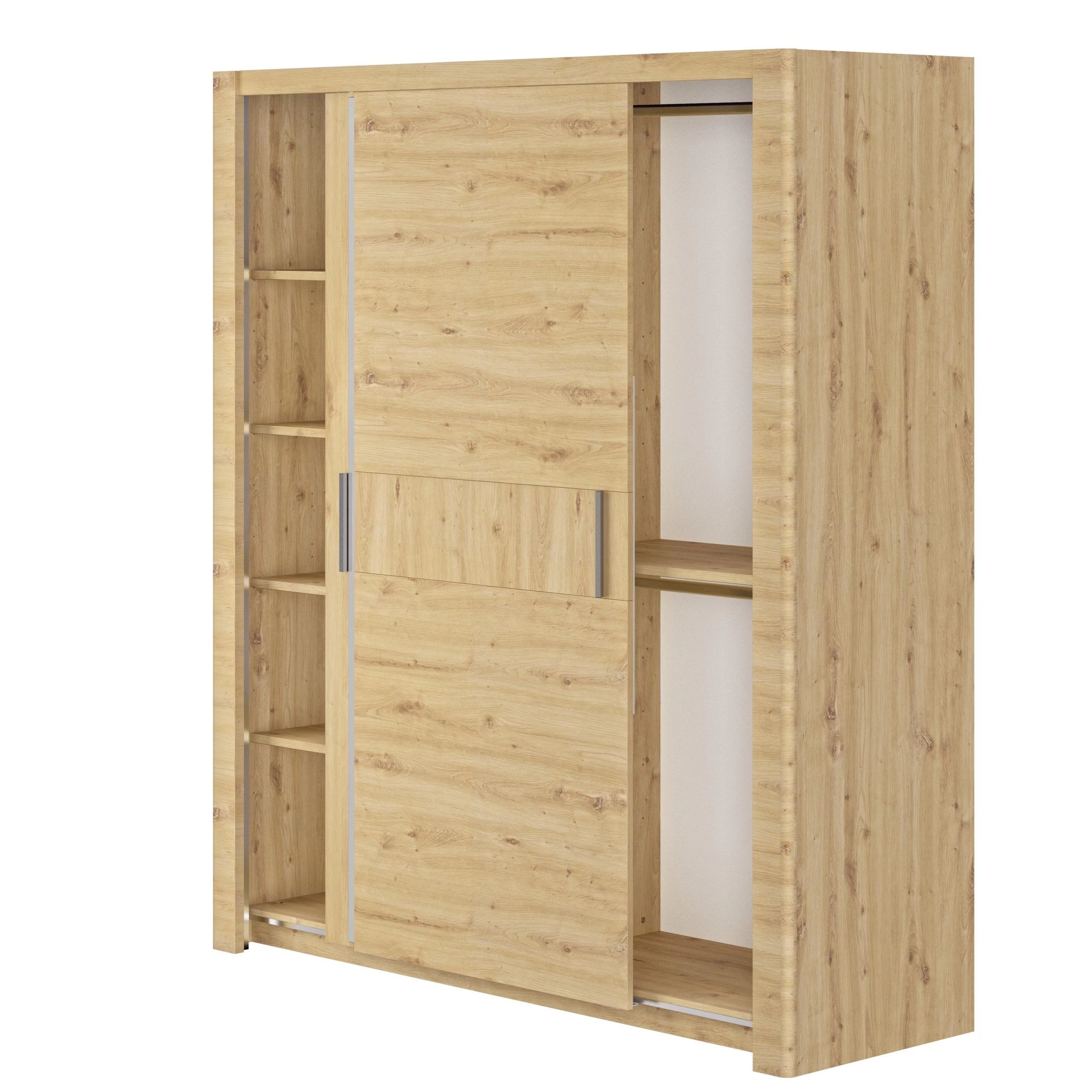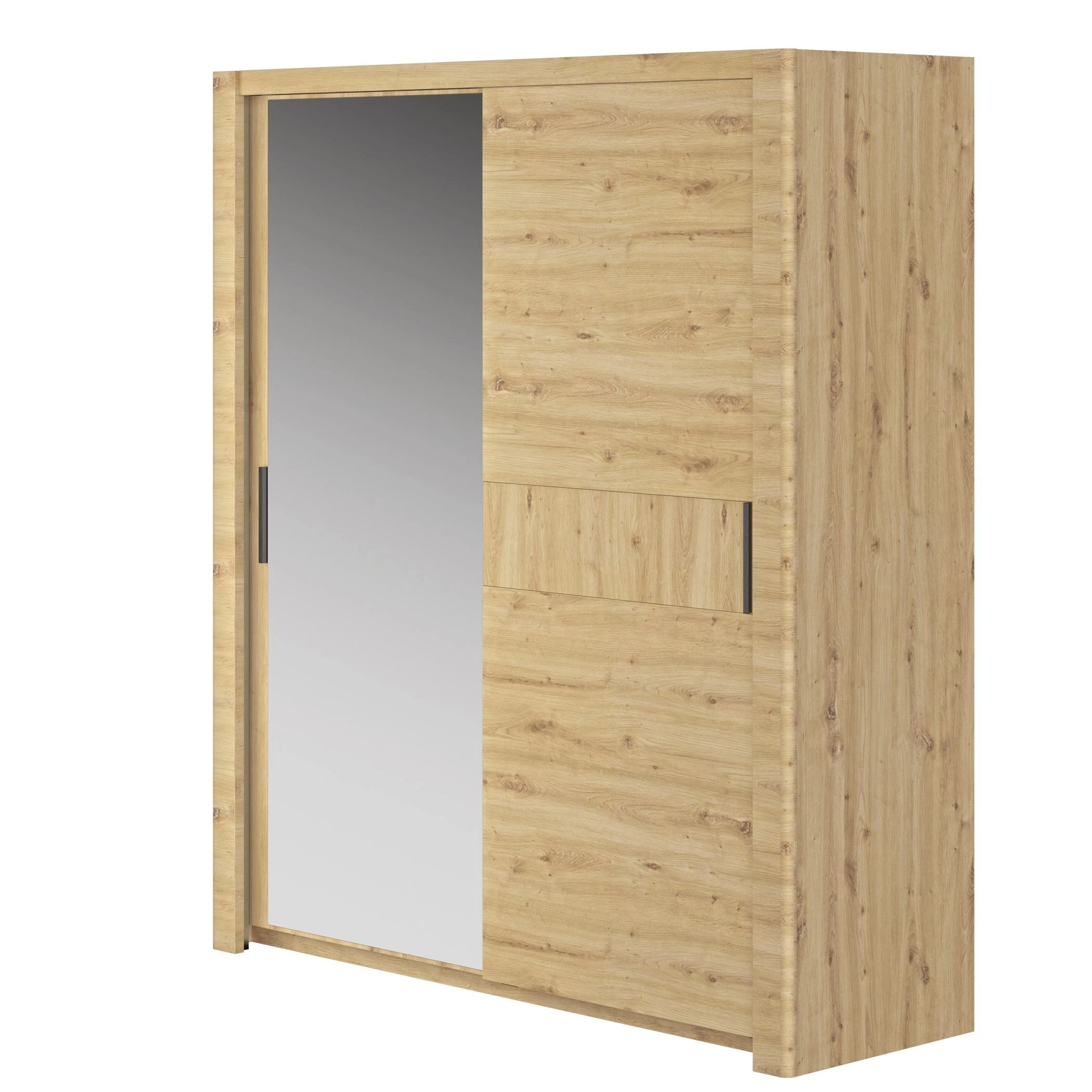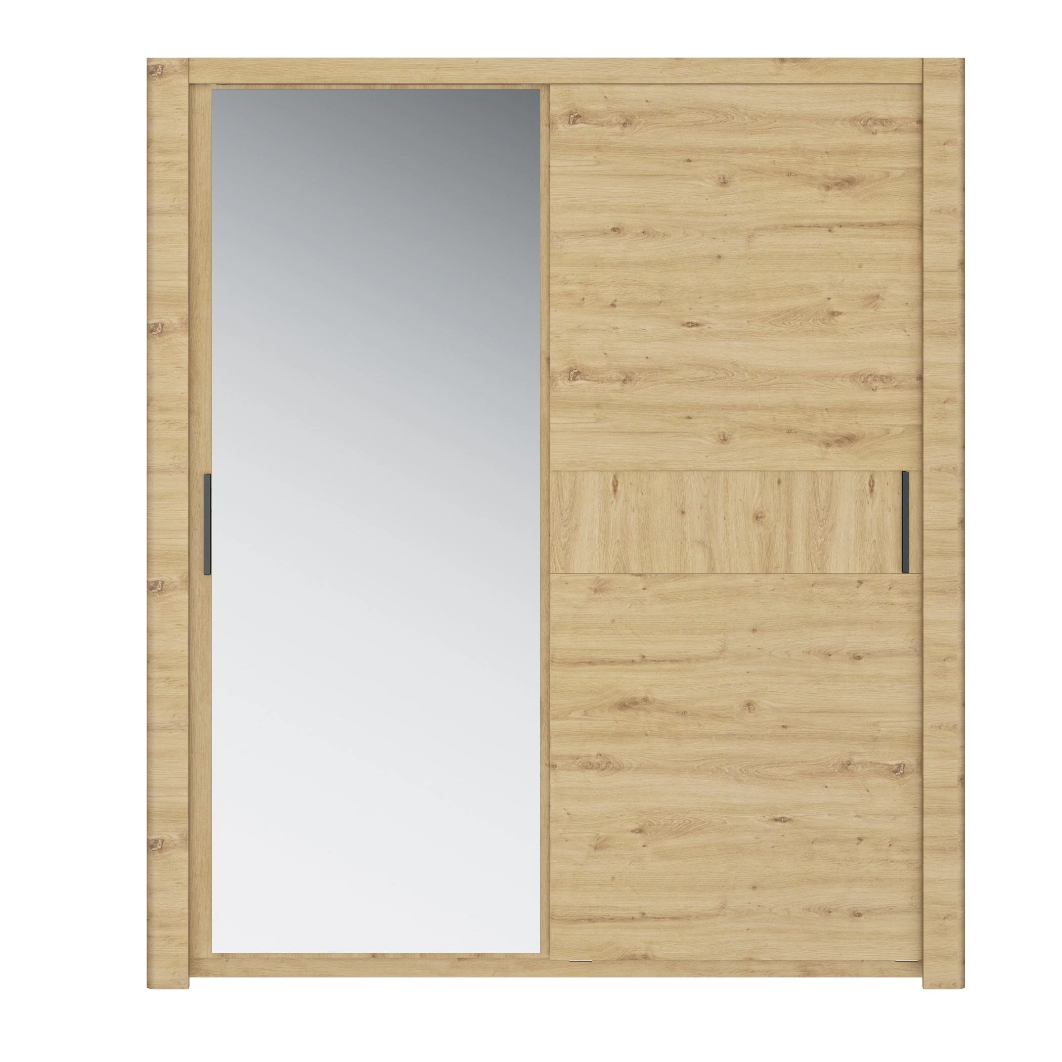 Deze ruime kledingkast bestaat uit twee deuren, waarvan één spiegeldeur. Achter de gewone deur vind je 2 kledingroedes en 1 grote legplank. Achter de spiegeldeur vind je 4 legplanken om t-shirts, truien of broeken weg te leggen.