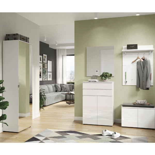 Strak en modern. Zo kunnen de producten uit de Bianca-collectie het beste omschreven worden. Ze hebben een sober, maar elegant design, waardoor ze in elke hal tot hun recht komen, en hebben door hun hoogglansafwerking een luxueuze uitstraling. De lades en deuren sluiten dankzij de dempers zacht en traag, waardoor de meubels minder snel beschadigd zullen worden. Kledingkast Bianca heeft 5 legplanken (max. 10 kg per plank) en een uitschuifbare kledingroede (max. 7 kg). 4 van de 5 legplanken zijn verstelbaar, je kan de kast dus aanpassen naar jouw wensen. Deze kledingkast heeft een spiegeldeur, waarin je je outfit nog even snel kunt checken voor je het huis verlaat. Bij deze kast kun je de deur zowel aan de linker- als aan de rechterkant van de kast bevestigen.Â