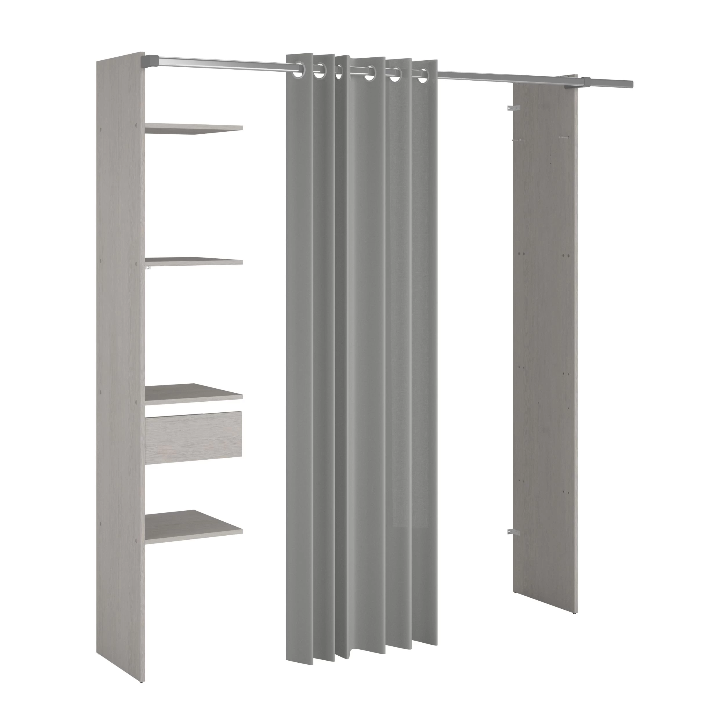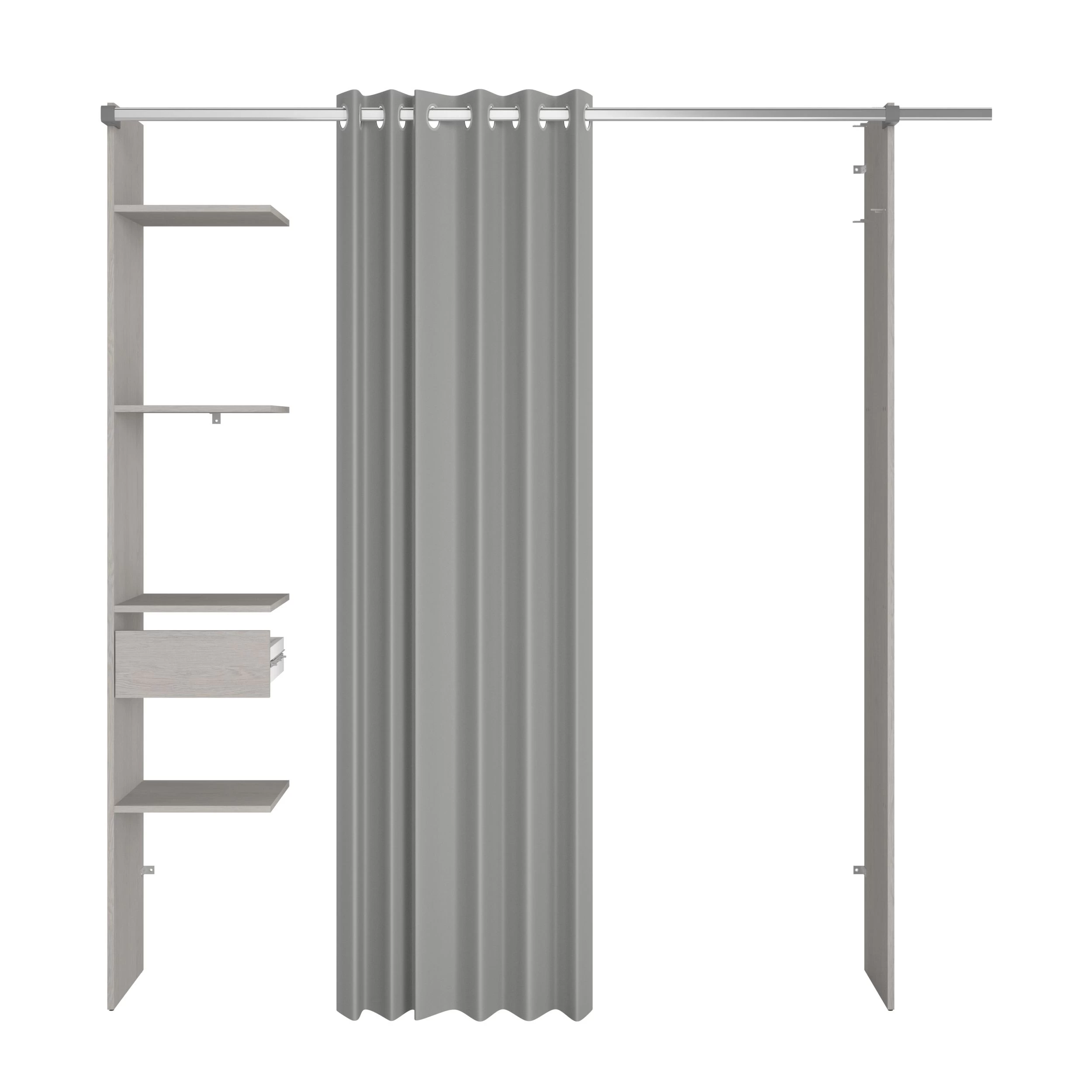 Deze kast is gemaakt uit spaanplaat met een grijze afwerking uit melamine. Ze is uitgerust met 4 legplanken, 1 lade en 1 gordijn. De bedoeling is dat je de kast aan de muur bevestigt zodat deze stevig staat.