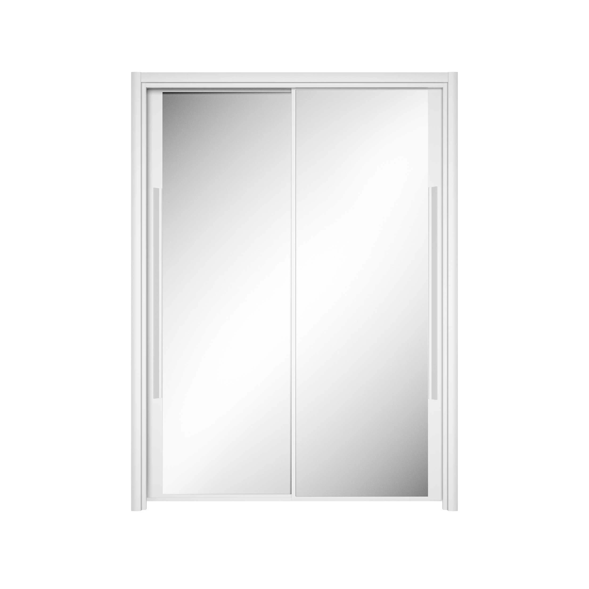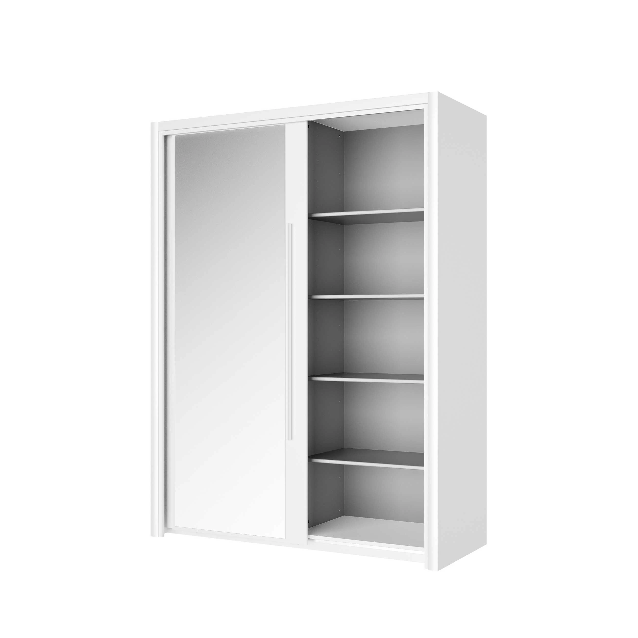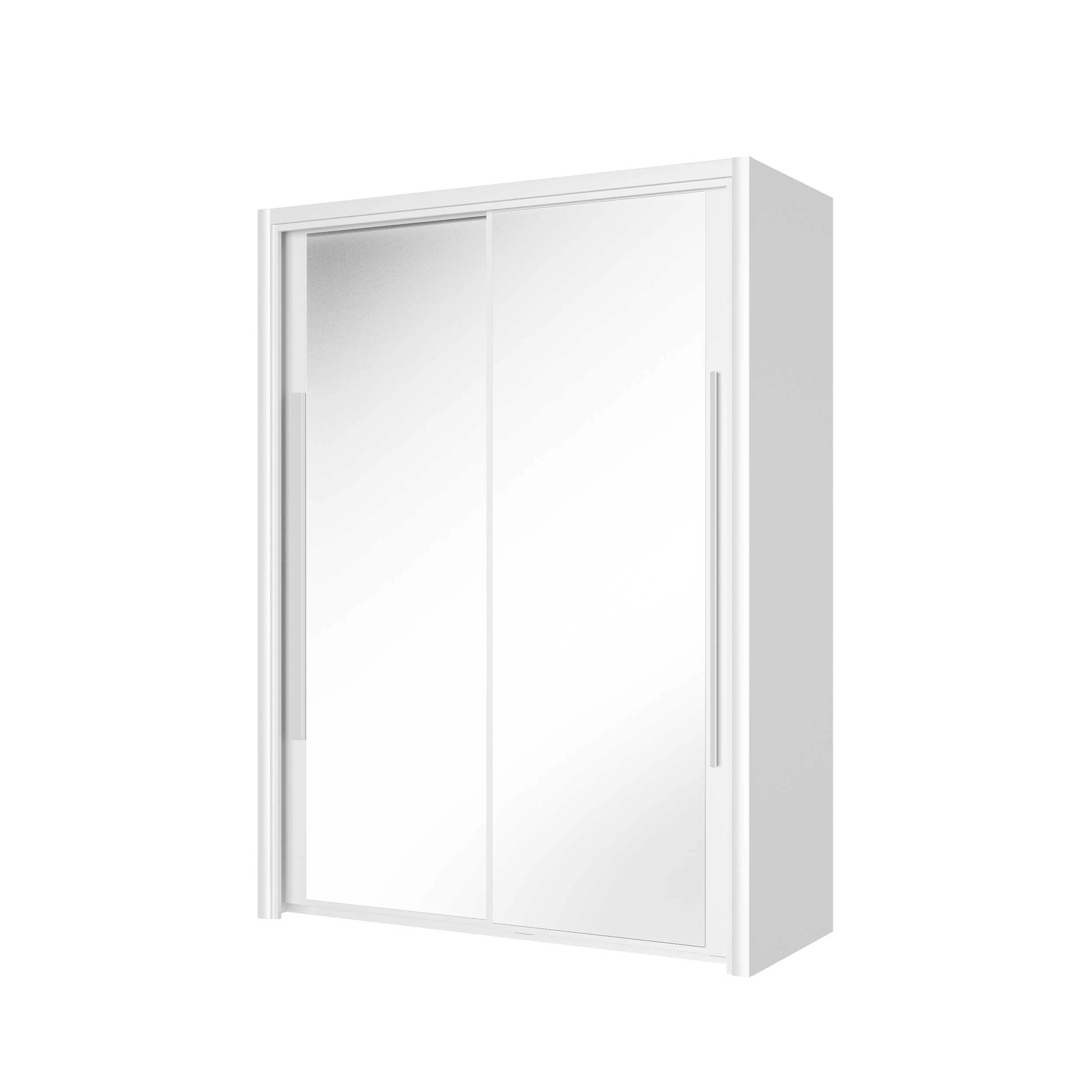 Deze kledingkast is afgewerkt in neutraal wit en uitgerust met 2 schuifdeuren in spiegelglas. Achter de ene deur vind je 2 kledingroedes, achter de andere deur 4 legplanken. Je kunt aan deze kast ook een ladeblok toevoegen (apart verkrijgbaar). Beschikbaar in meerdere formaten.