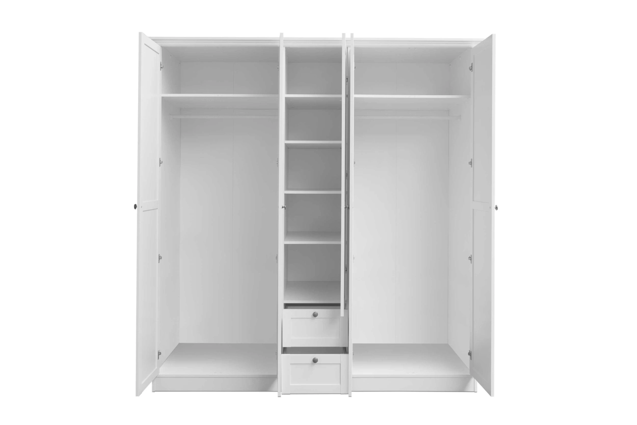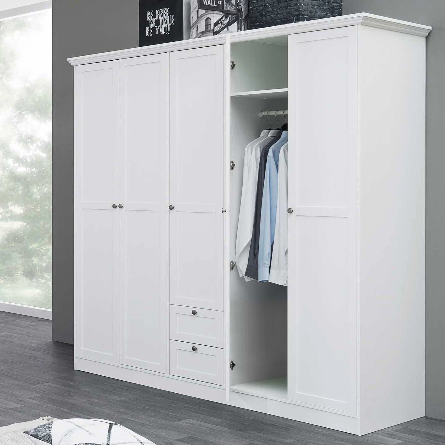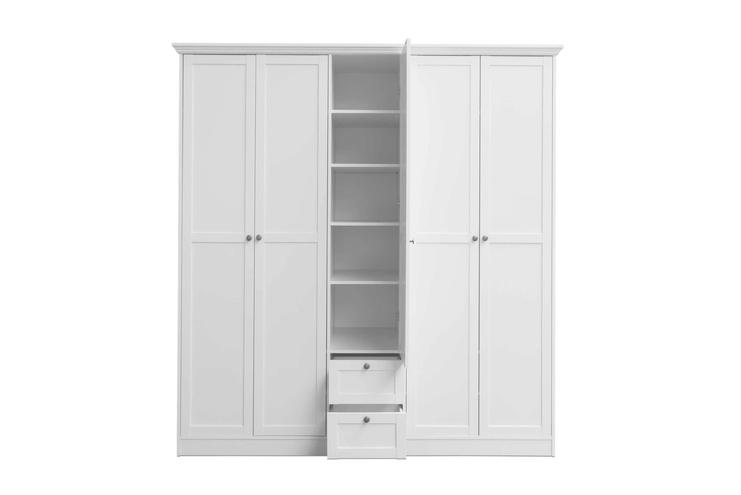 Deze 5-deurskledingkast beschikt over 2 kledingroedes, 2 grote en 4 smallere legplanken en 2 laden.