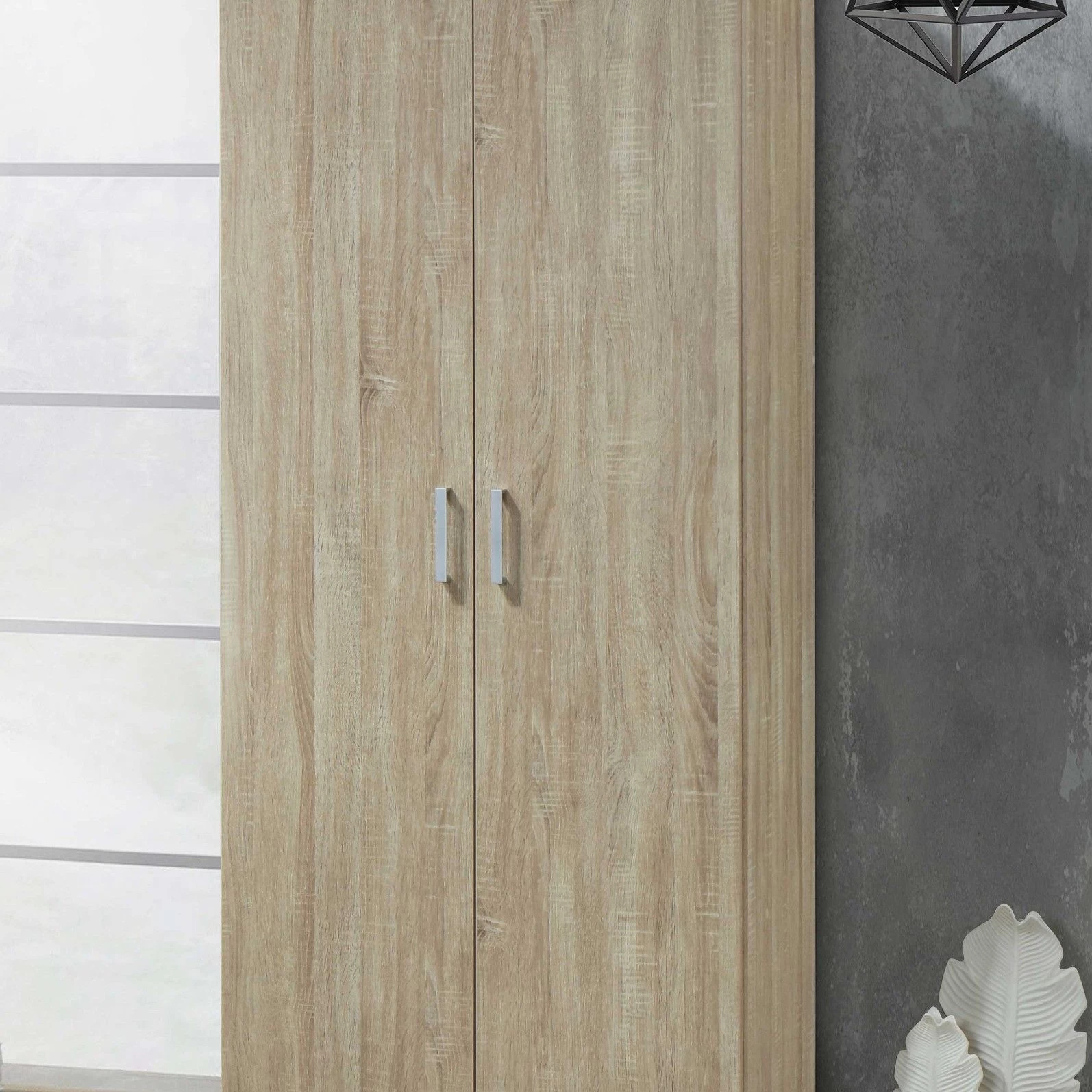 Nog op zoek naar een kast voor wat extra opbergruimte in huis? Deze Lias kledingkast met twee deuren telt twee legplanken en een kledingroede. De kast is gemaakt uit spaanplaat met een modern sonoma eikdecor en heeft twee grijze handvaten in kunststof.