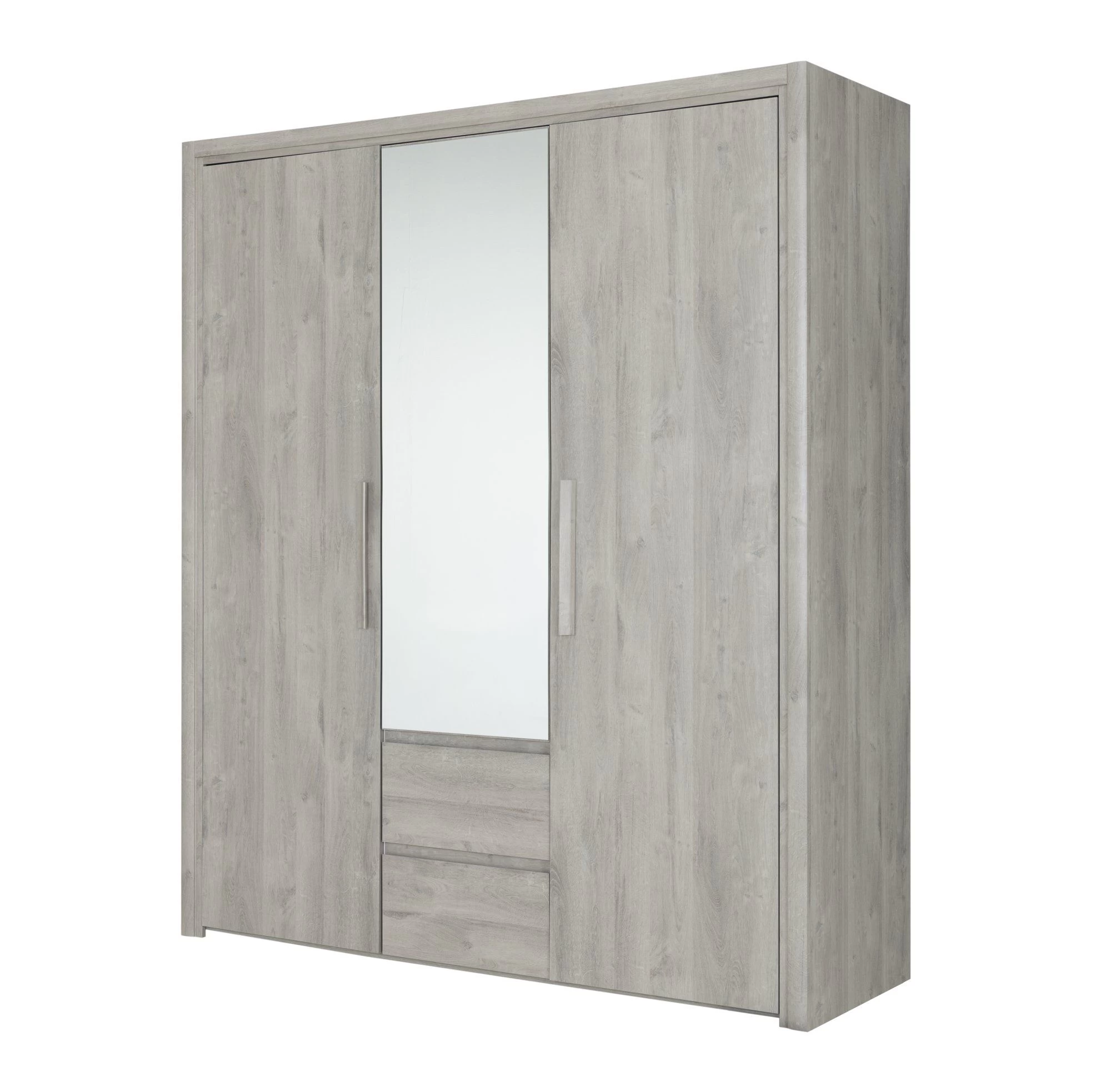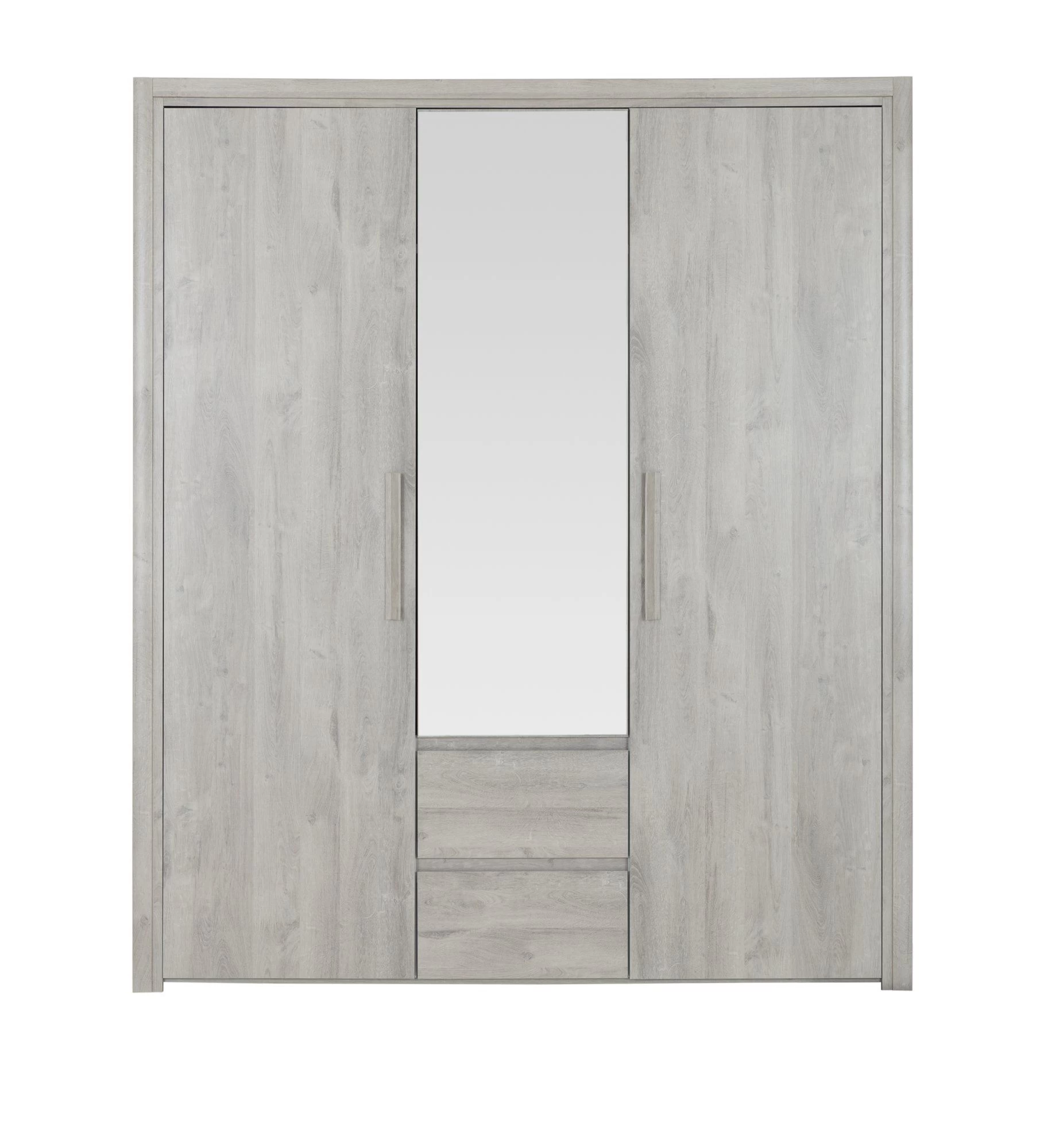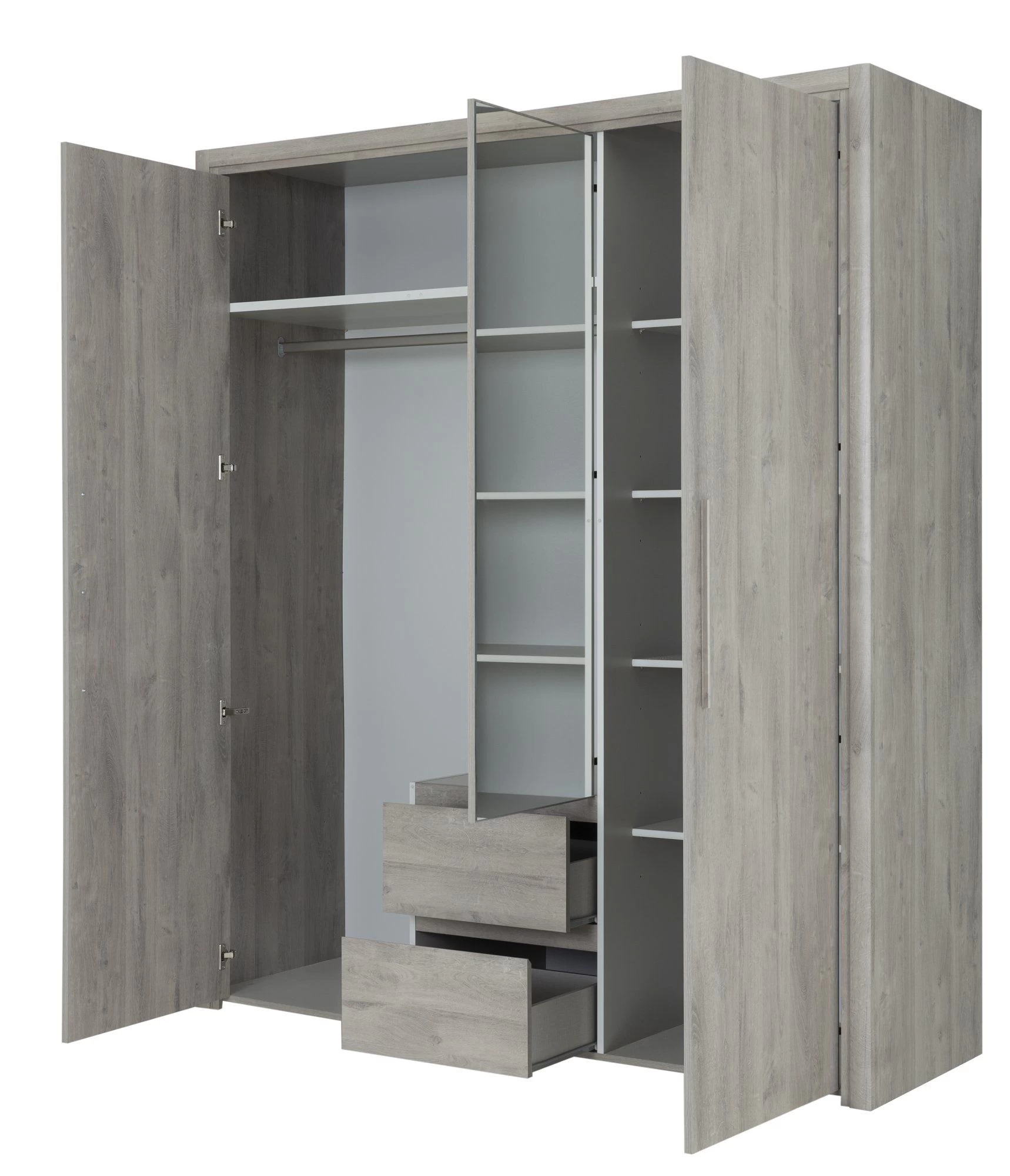 De kledingkast bestaat uit 2 opberglades en 3 draaideuren waarvan de middelste deur een spiegel heeft. Aan de ene kant van de kast beschik je over 4 legplanken. De andere kant is uitgerust met een legplank en een roede om je jurken, jassen… aan te hangen.
