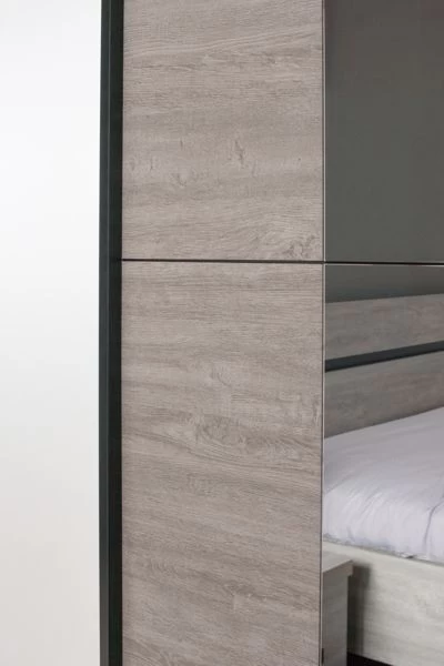 Kledingkast Maité, uitgerust met twee schuifdeuren. Gemaakt uit spaanplaat met een afwerking in grijze eik decor. Inclusief spiegels.