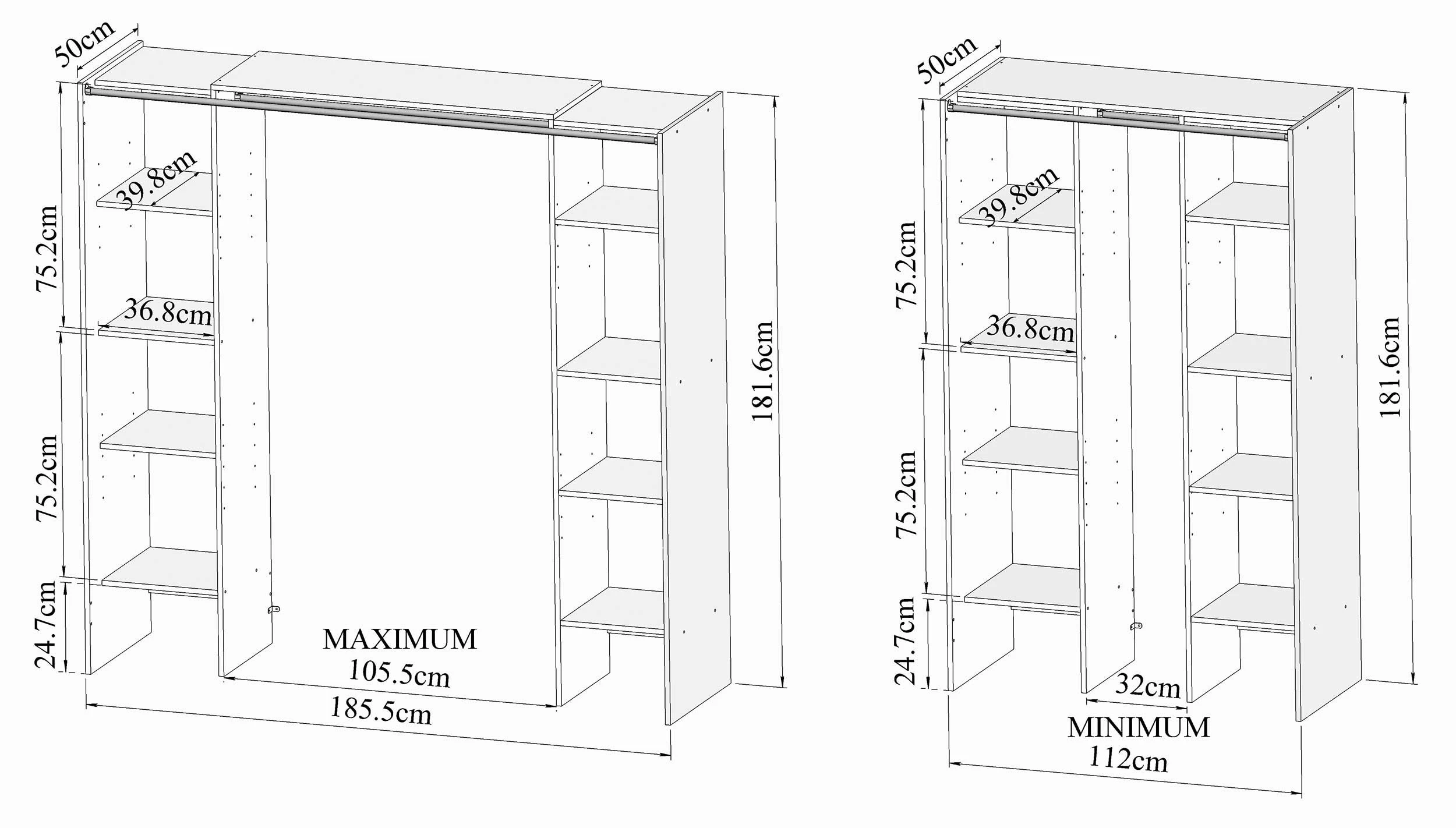 Ben je op zoek naar een kledingkast waarmee je een dressinggevoel kan creëren in de slaapkamer? Dan moet je voor kledingkast Spike gaan, die verschilt van alle andere kledingkasten door het gordijn dat de deuren vervangt. De kast beschikt over 8 legplanken en een kledingroede. Wat haar extra bijzonder maakt? Je kan de lengte zelf kiezen tijdens de montage: van 112 cm tot 185,5 cm. Zo pas jij jouw kledingkast aan aan de grootte van jouw kledingcollectie en/of jouw slaapkamer!