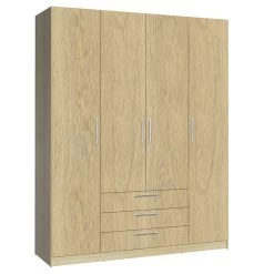 Voor een georganiseerde en aangename kamerindeling zit je bij de Tarn-kast vast en zeker goed. De kast is gemaakt uit spaanplaat inĀ eikdecorĀ en biedt je talloze opbergmogelijkheden. Er zijnĀ twee grote deurenĀ Ā aan beide zijkantenĀ en tweeĀ kleinere deuren binnenin.Ā Onder die kleine deuren zijn nogĀ drie opbergladesĀ voorzien. Achter de twee kleine deuren is bovendien een handigeĀ kledingstangĀ voorzien. Rond om rond worden door de legplanken leuke opbergvakjes ingericht. Zo kan je al je kledij en accessoires, met verschillende volumes, gemakkelijk kwijt in dit meubel.Ā