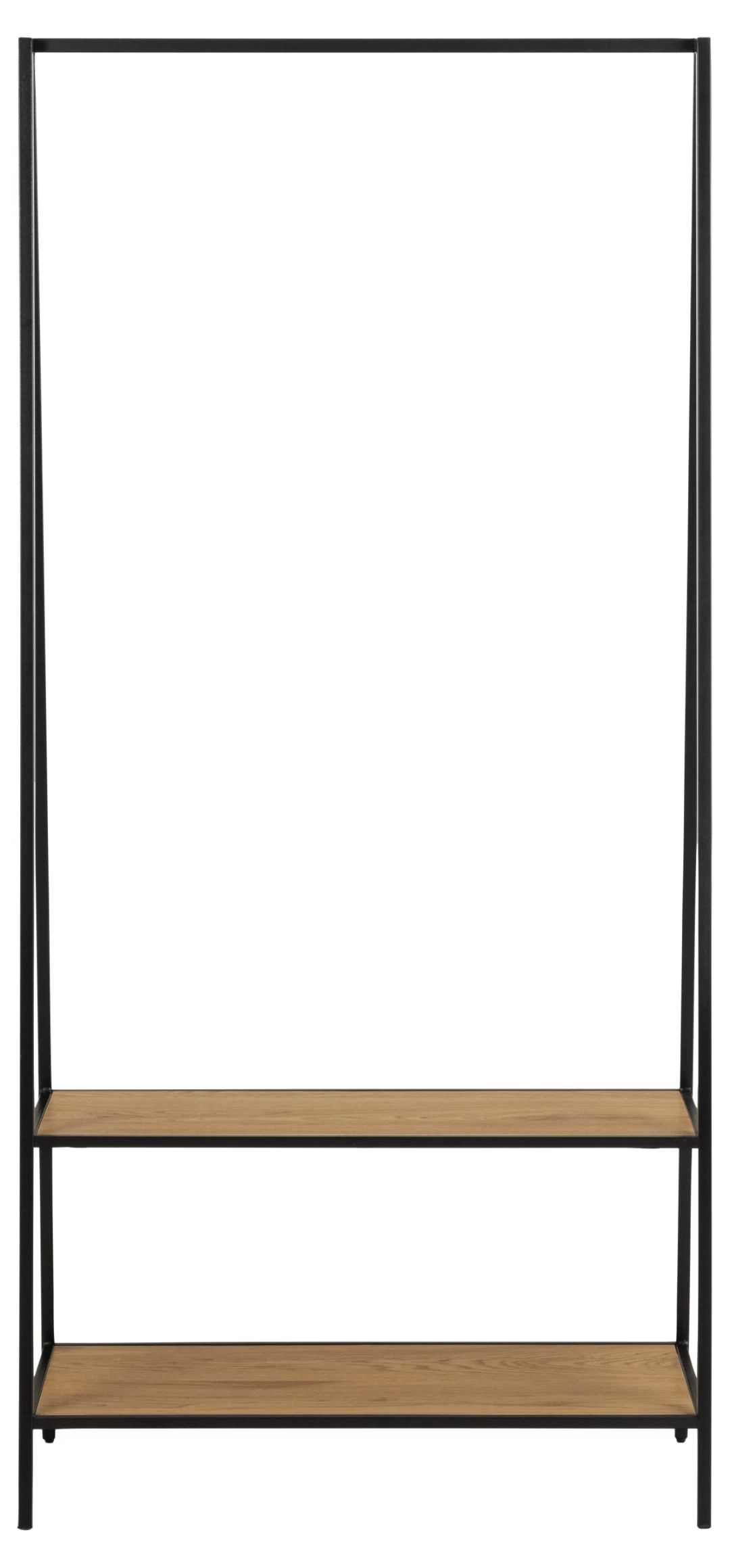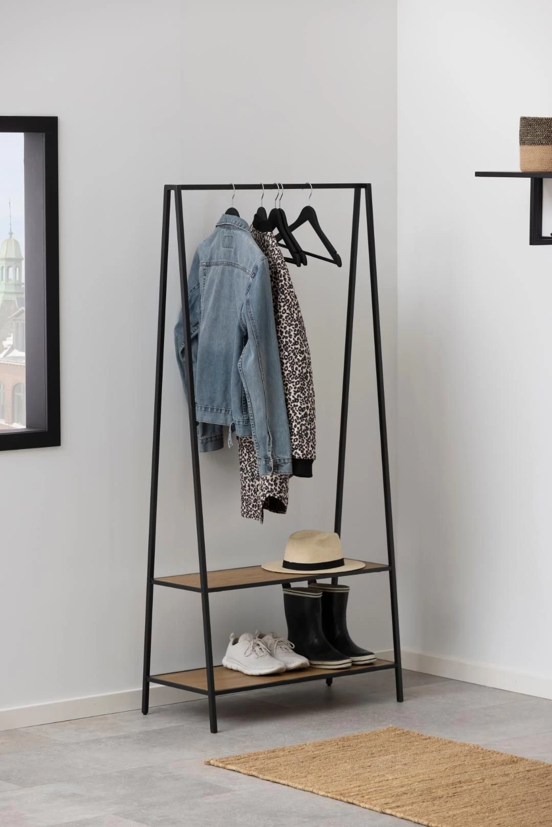 Dit handige Dover-kledingrek is ideaal om in je hang of slaapkamer te plaatsen. Dit rek is gemaakt uit zwart gepoedercoat metaal en wilde eik decor. Het Dover-kledingrek is praktisch dankzij haar kledingroede en twee legplanken. Je kan gemakkelijk je jassen aan de kledingroede hangen en de legplanken gebruiken om hoeden of schoenen op te plaatsen.