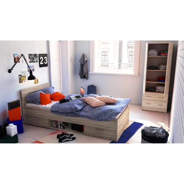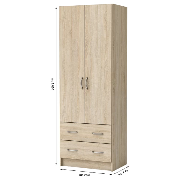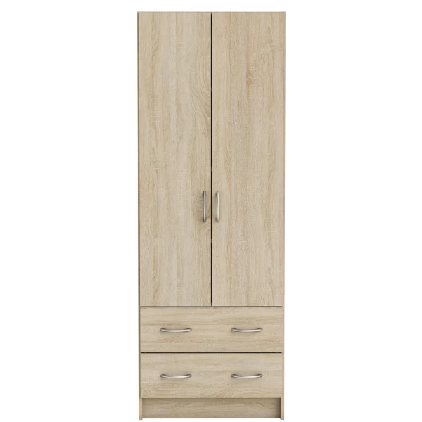 Deze kleerkast past dankzij zijn neutraal ontwerp in bijna elk interieur. Het lichte geborstelde eikdecor zorgt voor veel lichtinval in uw slaapkamer. De kast is voorzien van 3 legplanken en 2 lades die de nodige ruimte bieden voor uw kledij. Het compacte formaat van deze kast maakt dat hij ideaal is om als extra opbergmogelijkheid te gebruiken in kleinere slaapkamers of andere kleinere ruimtes. Vijzen en pluggen voor wandmontage zijn niet inbegrepen.Â
