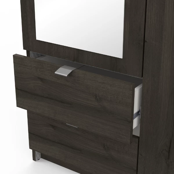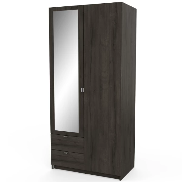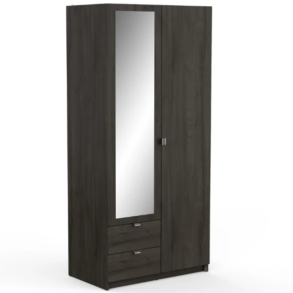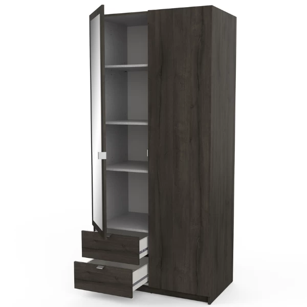 Kleerkast Melinda is gemaakt uit gemelamineerde spaanplaat met Waterford eikdecor en heeft grijze handgrepen. De kast bestaat uit 2 draaideuren, 3 legplanken, 1 kledingroede, 2 lades en 1 spiegel.Â