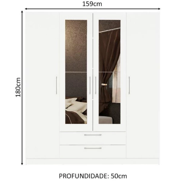 Kleerkast Rhea is gemaakt uit gemelamineerde spaanplaat in wit. De kast bestaat uit 4 draaideuren, 5 legplanken, 2 kledingroedes en 2 lades.Â