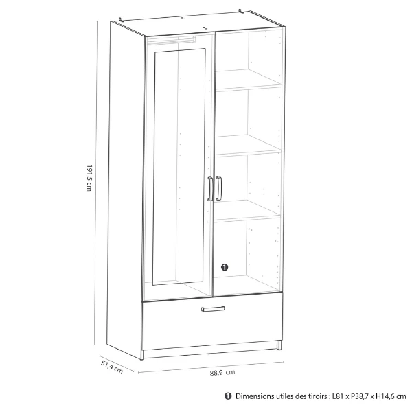 Kleerkast Ryan is gemaakt uit gemelamineerde spaanplaat in Kronberg eikdecor, mat wit en een gewoven linnendecor aan de binnenkant en heeft aluminiumgrijze kunststoffen handgrepen. De kast bestaat uit 2 draaideuren, 3 legplanken, 1 kledingroede en 1 lade.