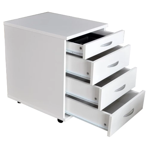 Ladeblok Annevar is gemaakt uit gemelamineerde spaanplaat in wit en bestaat uit 4 lades waarvan één met pennenbak. De handgrepen zijn uit kunststof met aluminium-look. Het ladeblok beschikt over 4 wielen waarvan 2 met rem.Â
