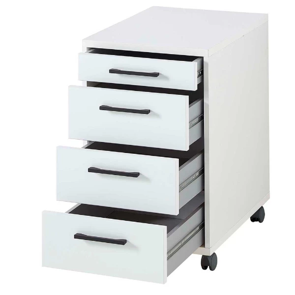 Ladeblok Inovo 43x55x68cm uit MDF, afgewerkt met melamine in het wit en metalen handgrepen. Met vier lades en wieltjes.