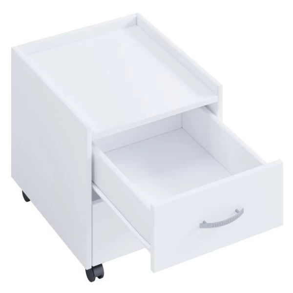 Ladeblok Kjenta is gemaakt uit gemelamineerde spaanplaat in wit en bestaat uit 2 lades waarvan 1 met pennenbakje. De kast beschikt over 4 wieltjes waarvan 2 met rem.