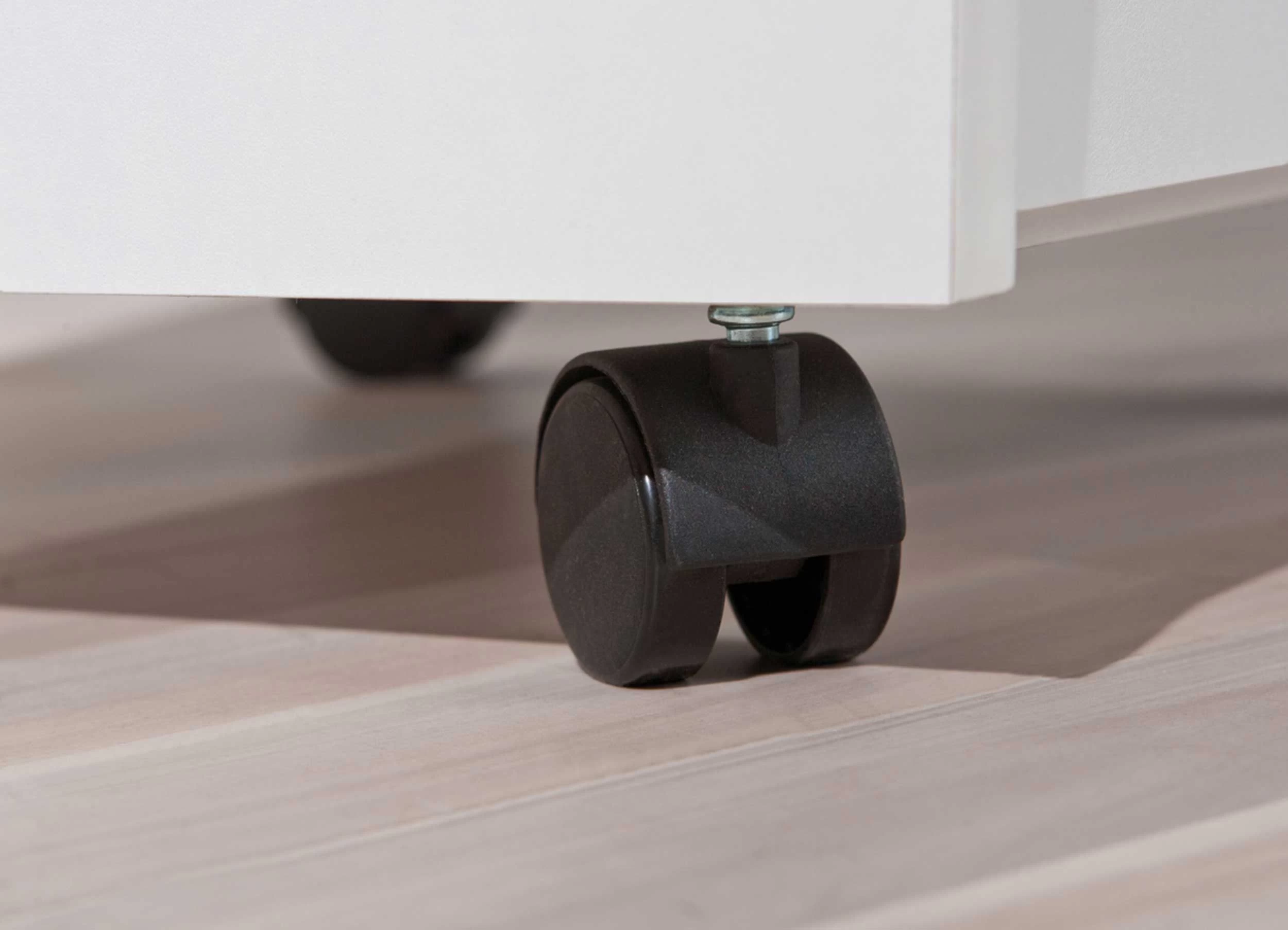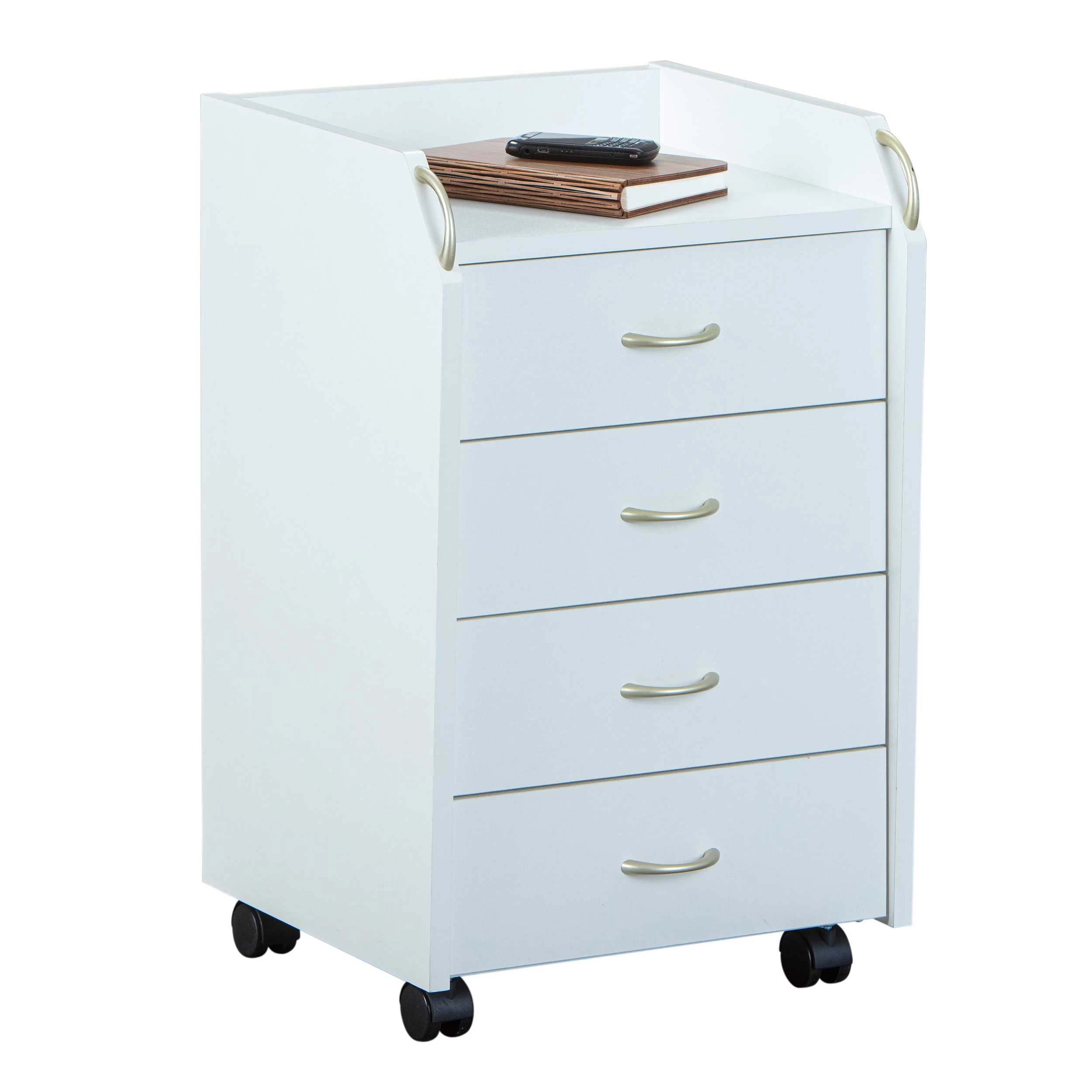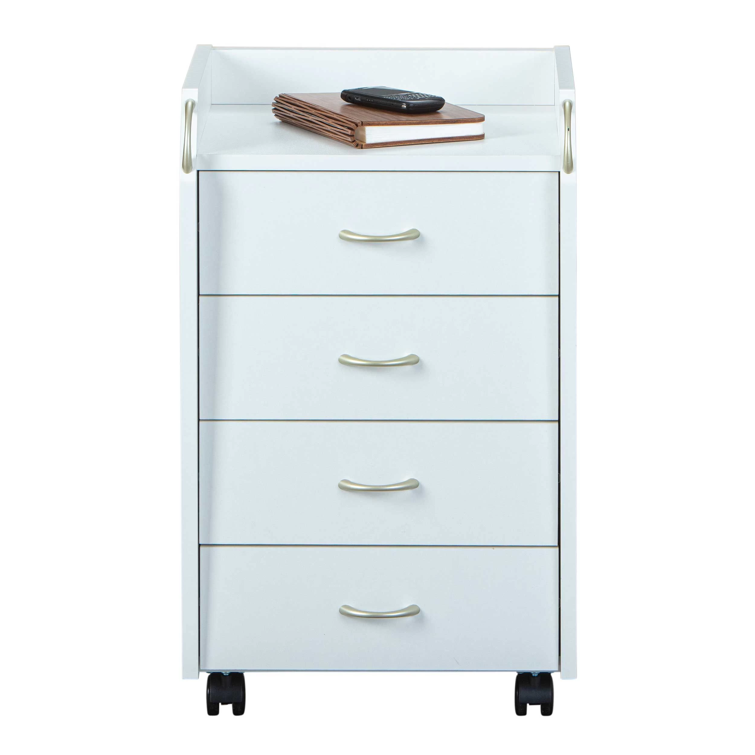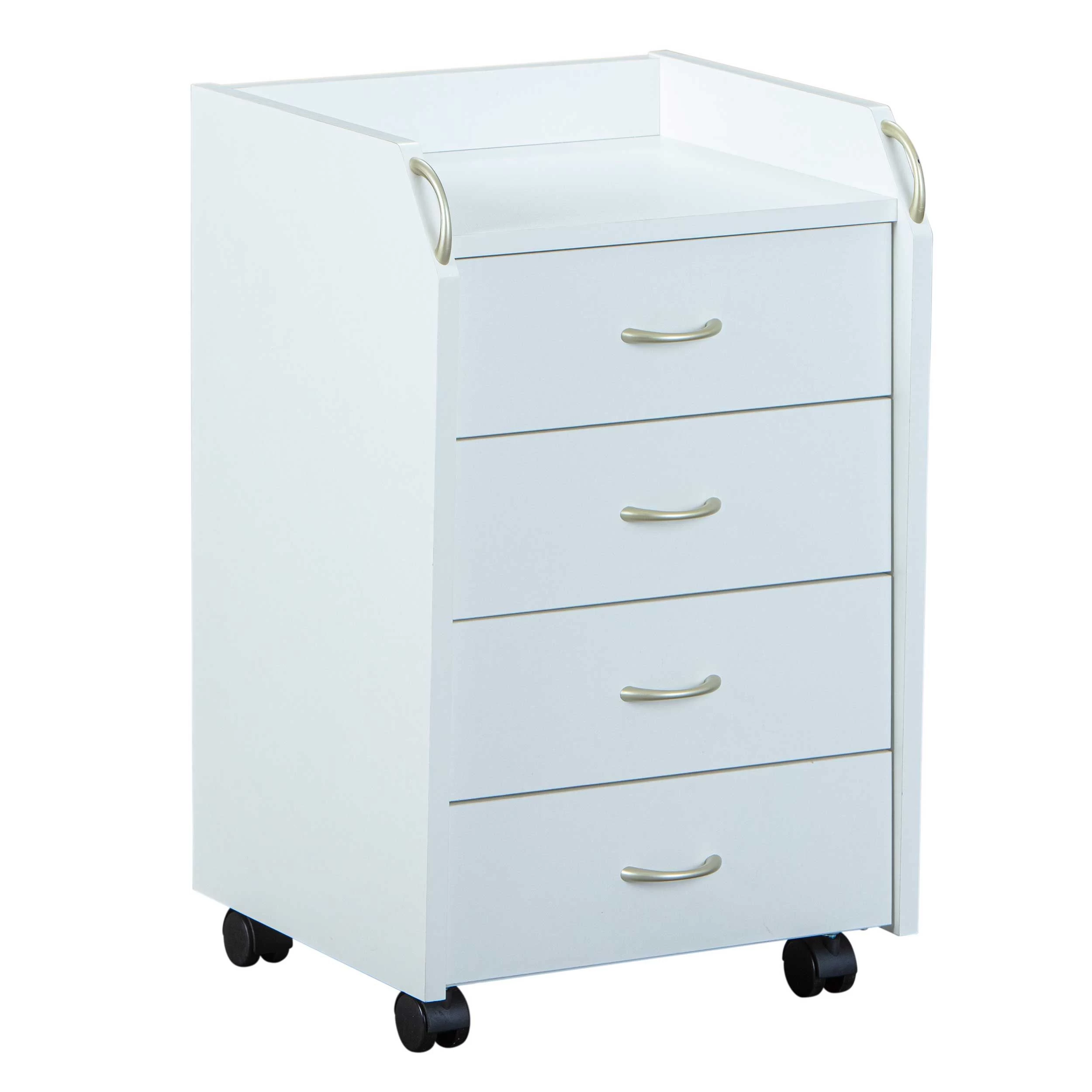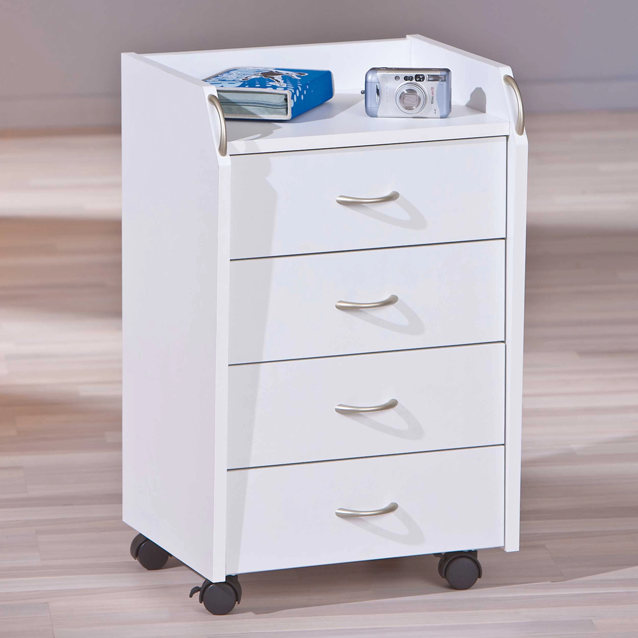 Handig ladeblok op wieltjes, met in totaal vier opberglades, perfect voor al jouw kantoorbenodigdheden, formulieren en andere papierwaren. Het witte decor van het kastje zelf combineert mooi met de aluminium handgrepen en donkerkleurige wieltjes. Een gemakkelijk verplaatsbaar meubel dat in elke kantoorruimte zijn plek heeft!