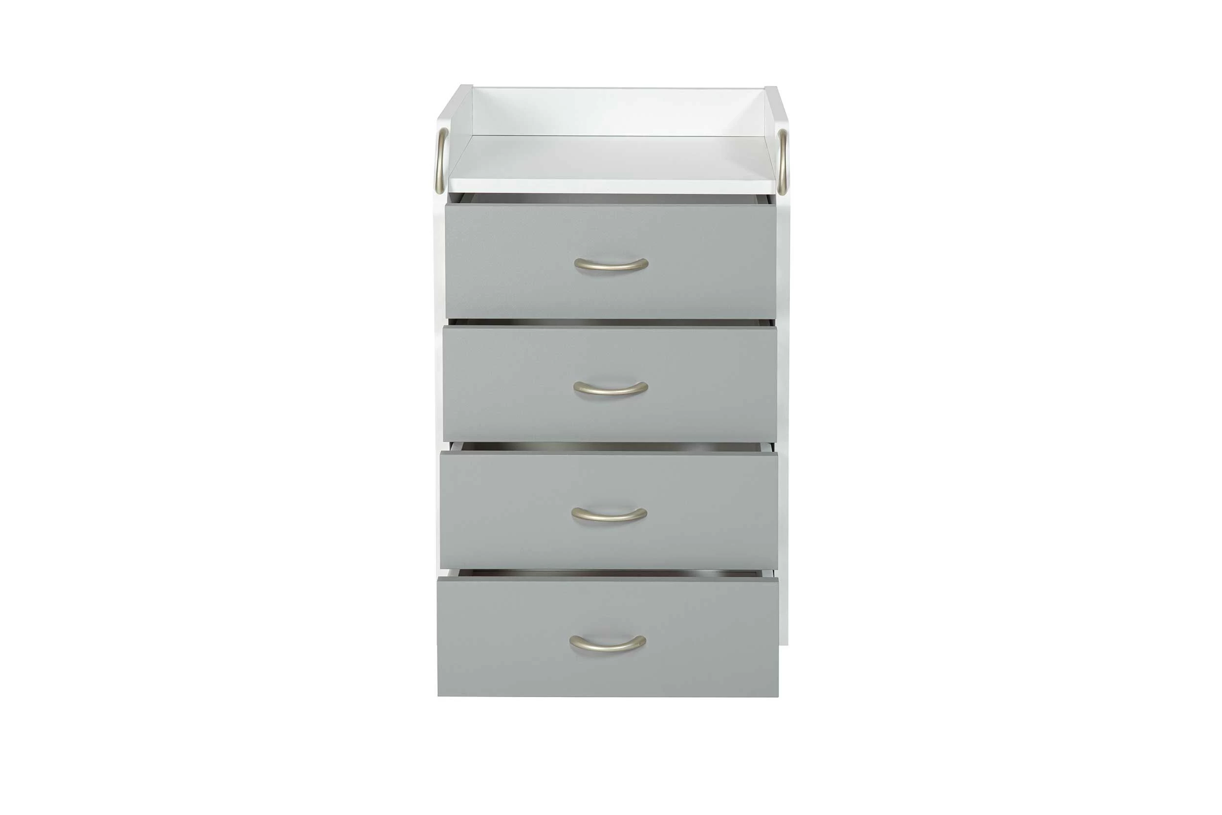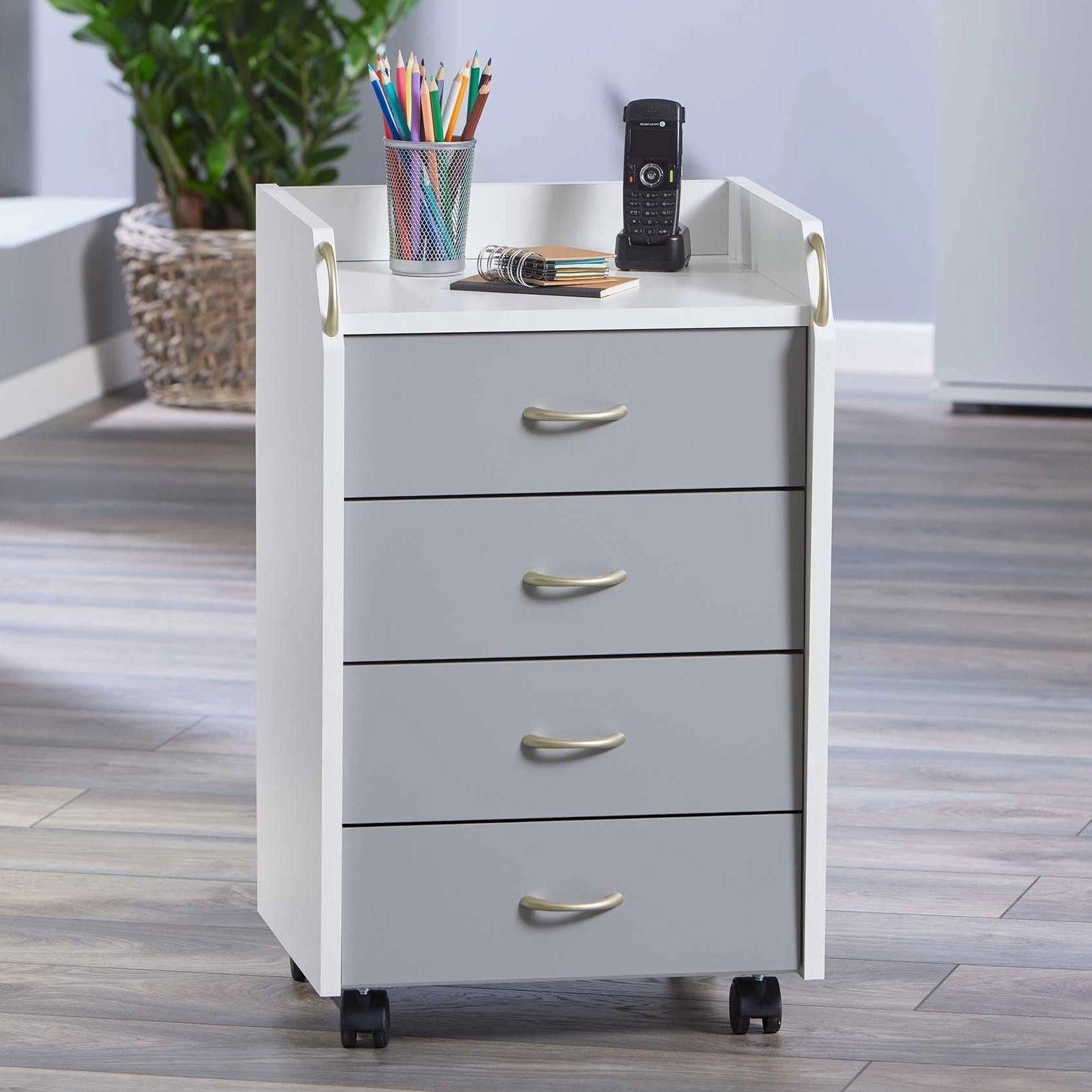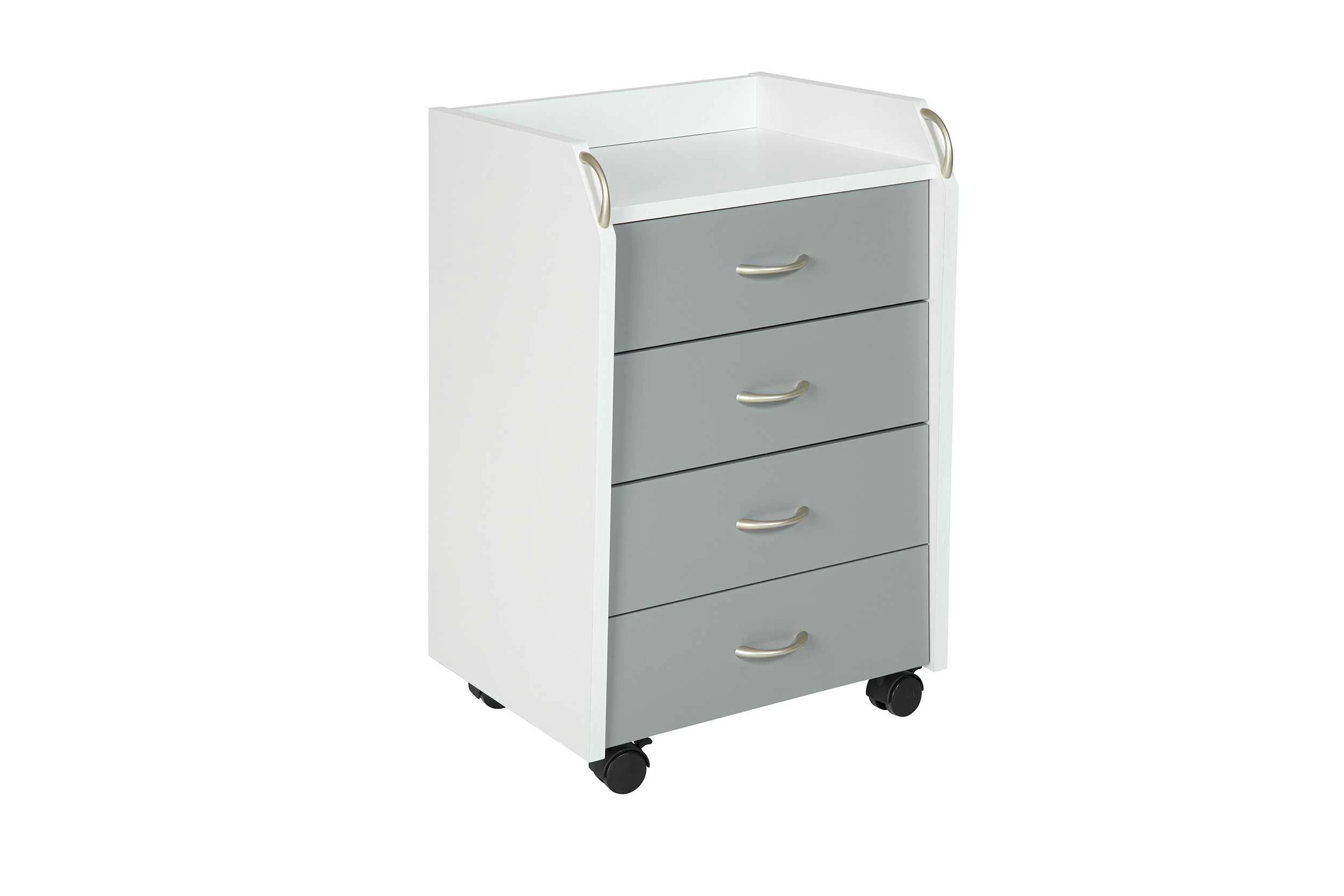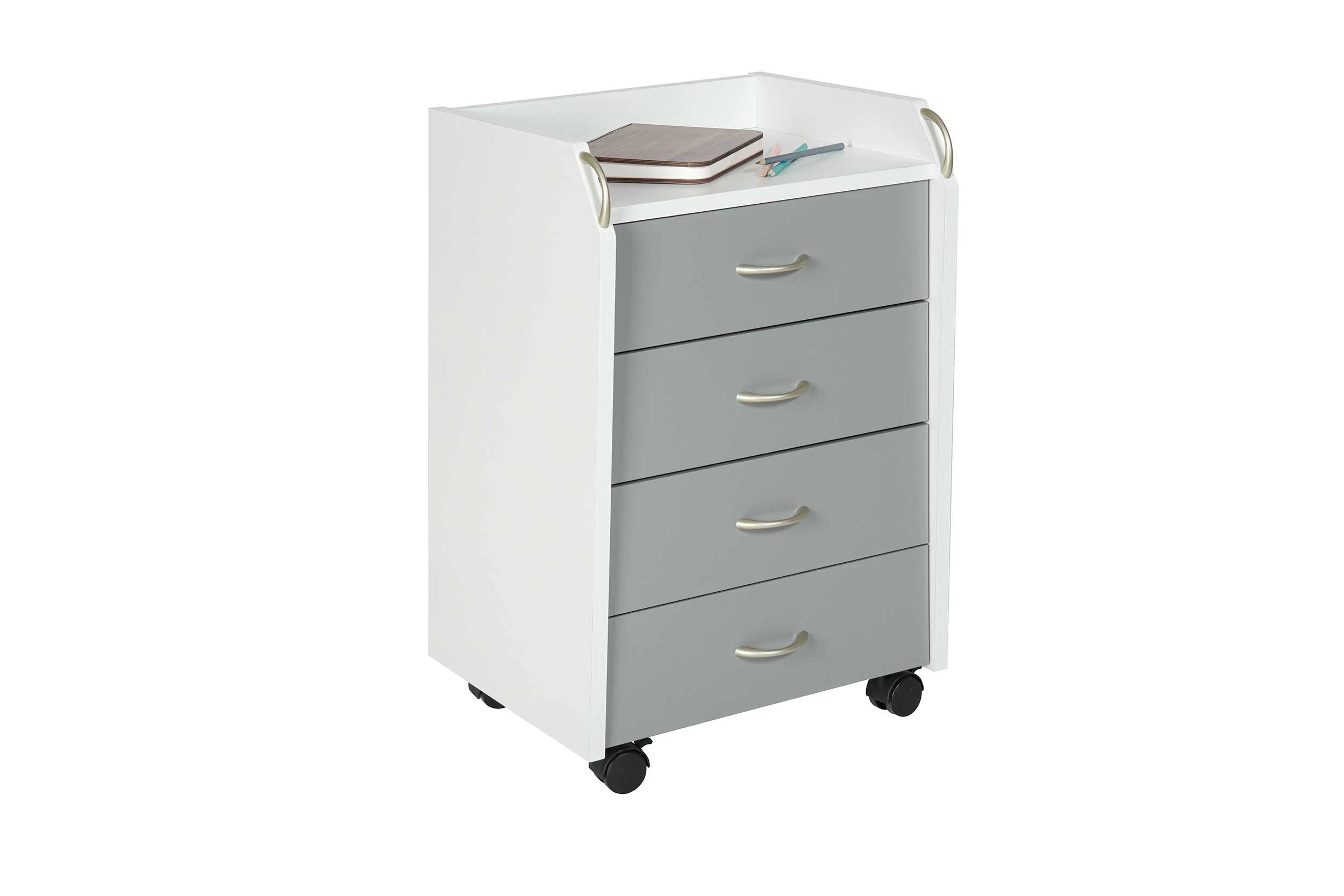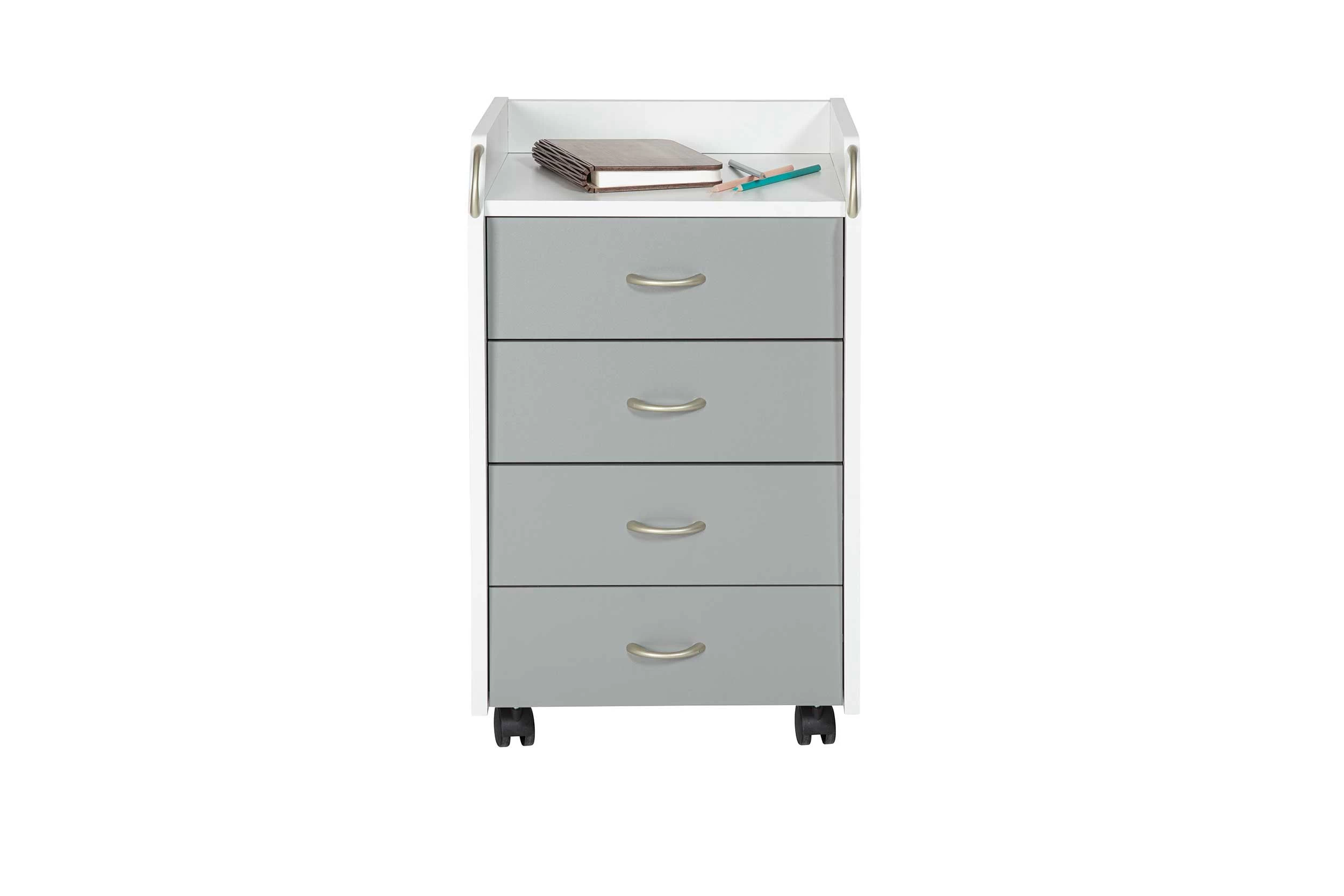 Ladeblok Primi op wieltjes, uitgerust met 4 lades. Gemaakt uit spaanplaat grijs en wit.