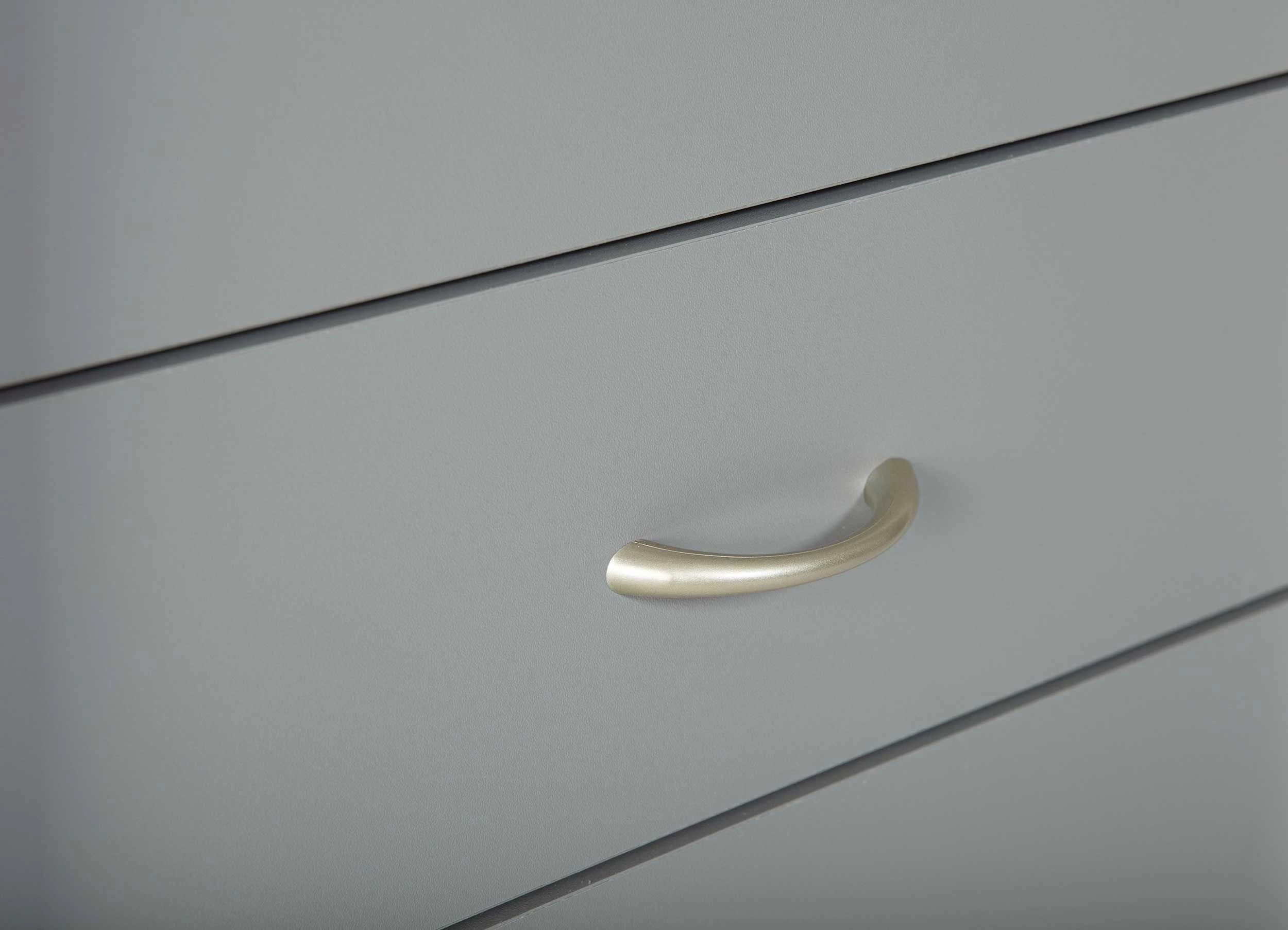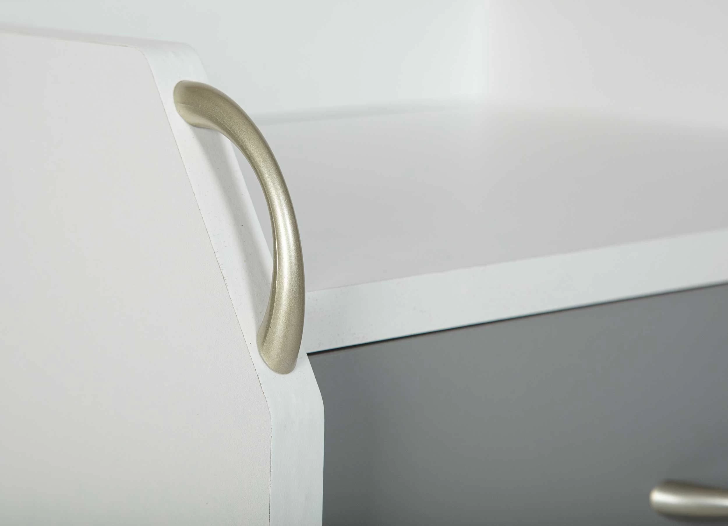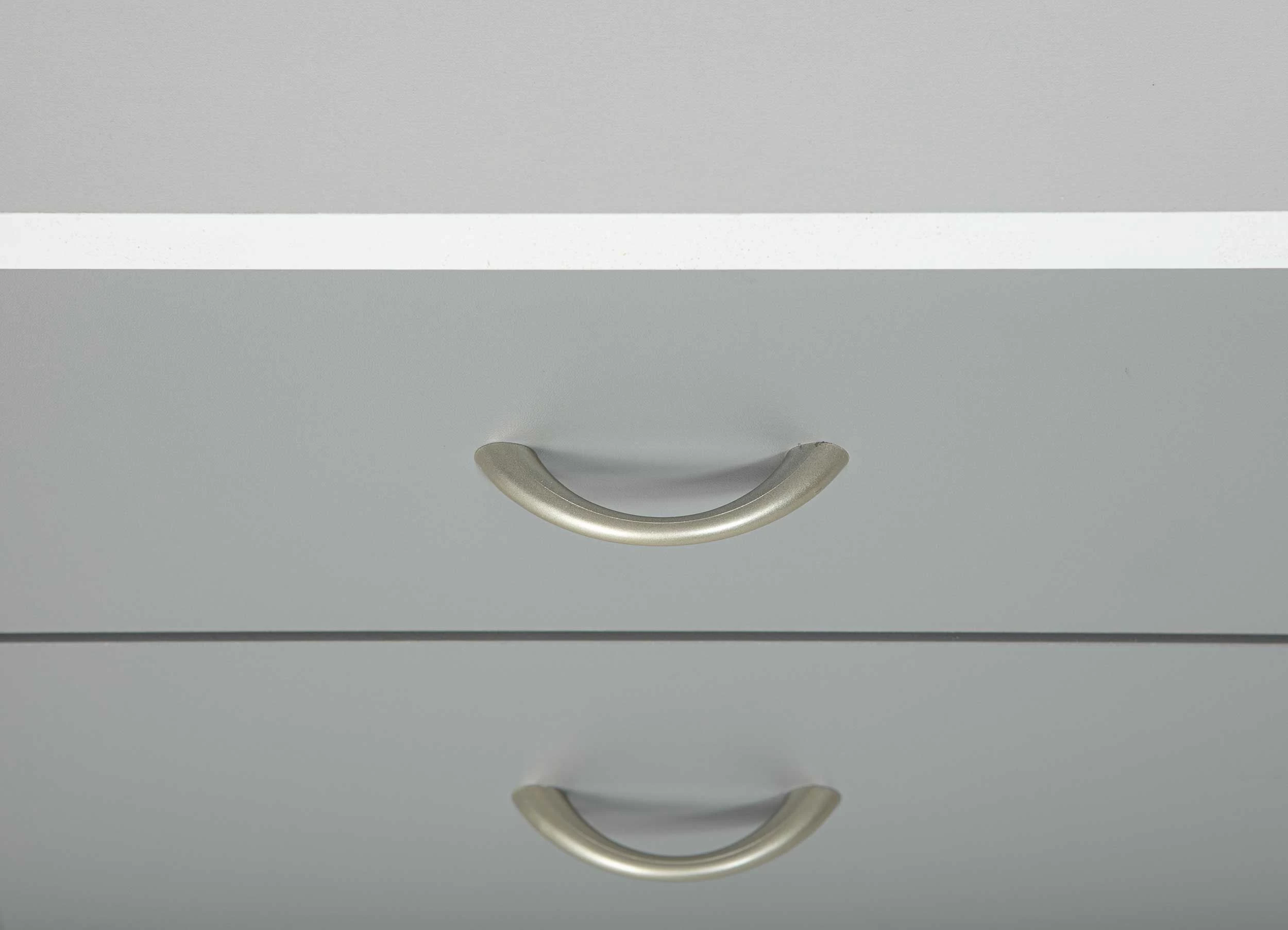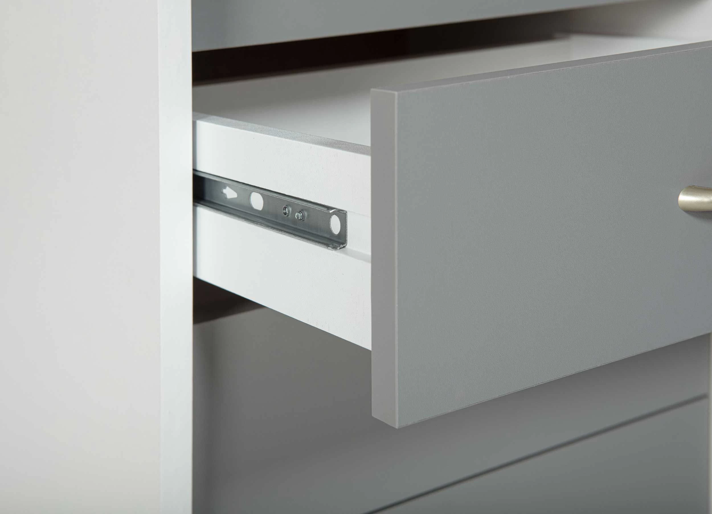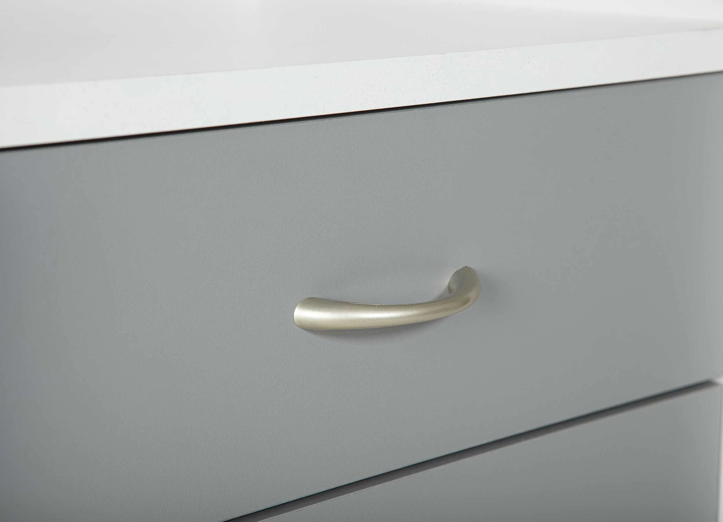 Ladeblok Primi op wieltjes, uitgerust met 4 lades. Gemaakt uit spaanplaat grijs en wit.