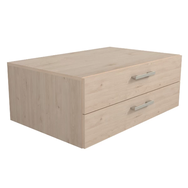 Ladeblok voor dressingcombinatie Playa 86.2x56x32.2 uit spaanplaat met afwerking in eikdecor. Bestaat uit twee lades met metalen handgrepen.