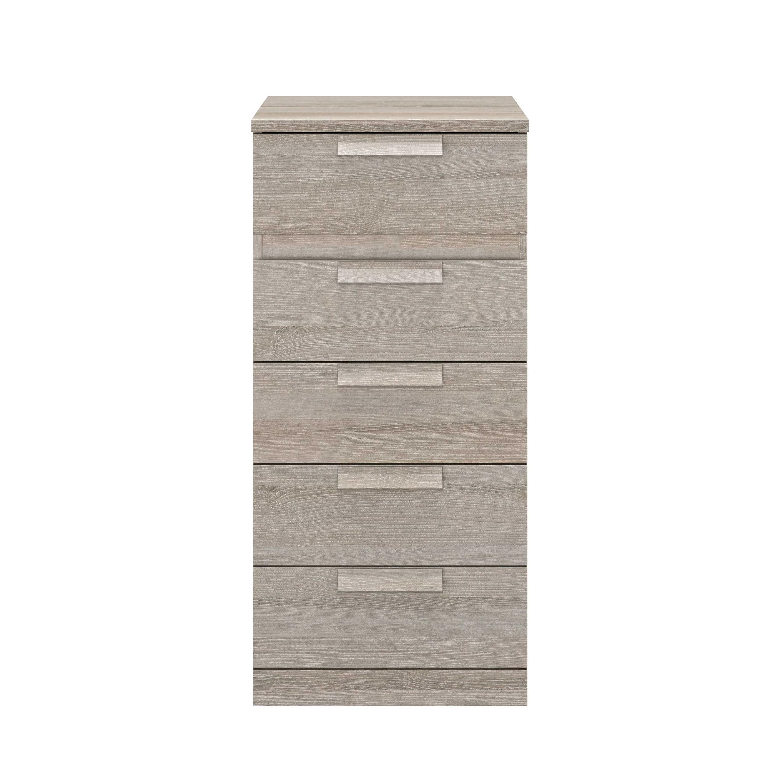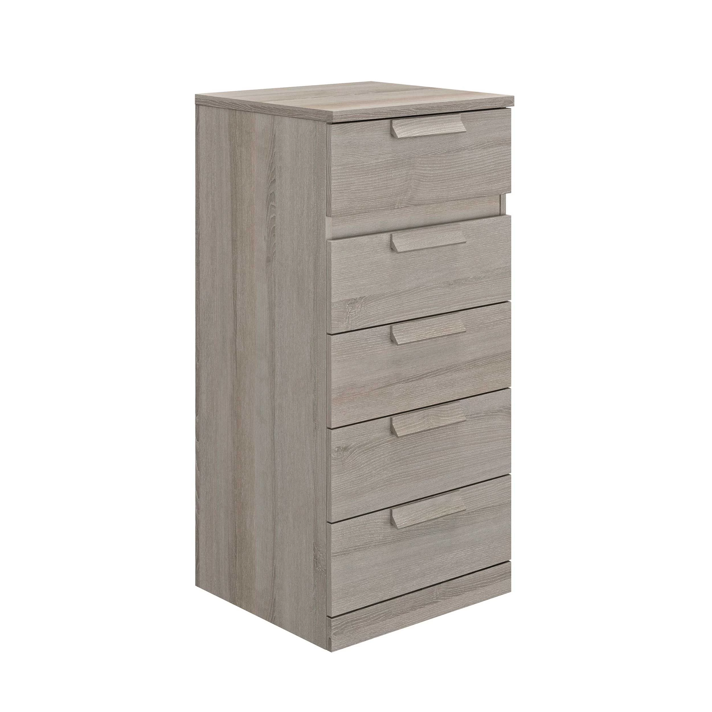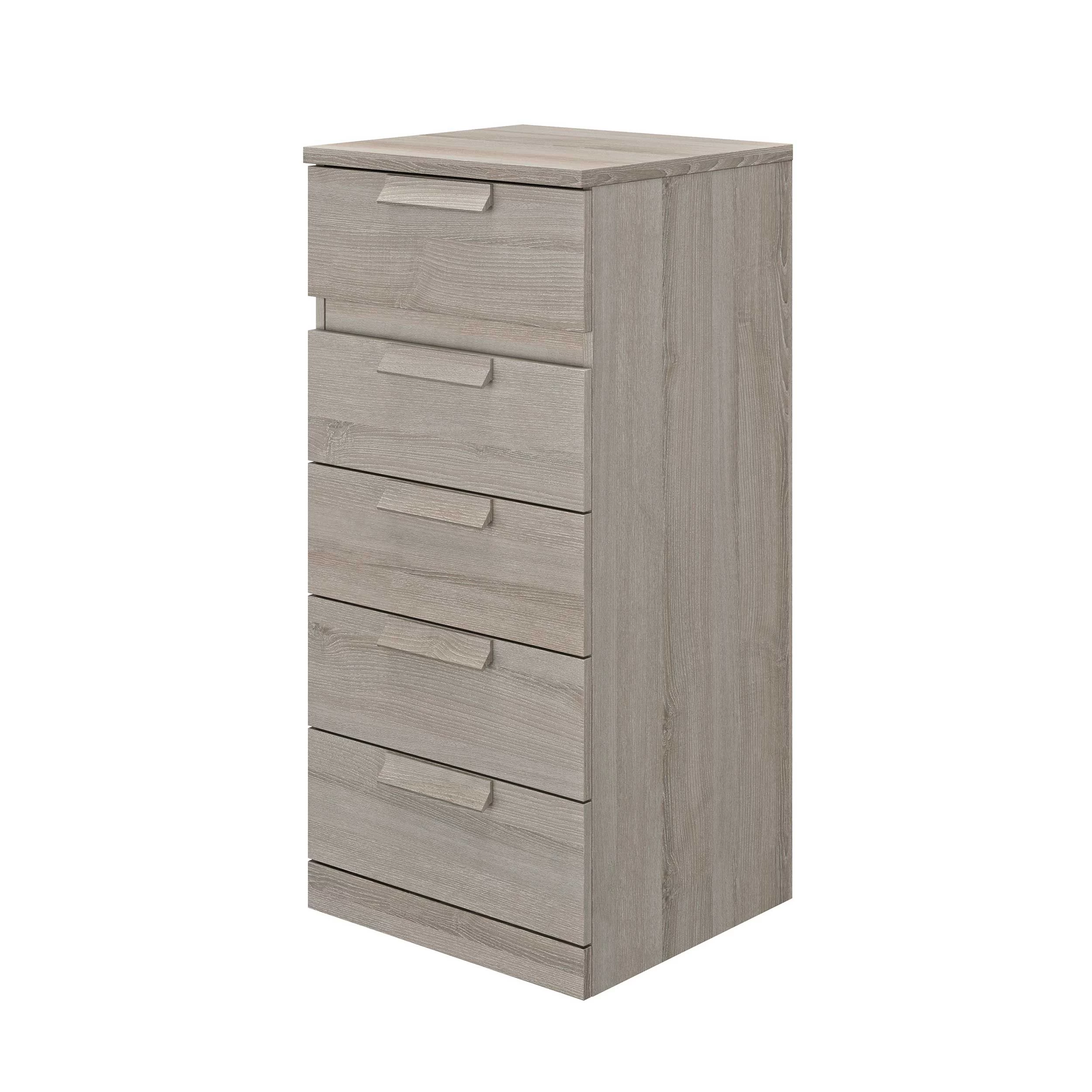 In de 5 lades van deze smalle kast kun je heel wat spullen kwijt. De kast is afgewerkt in lichtgrijze eik.