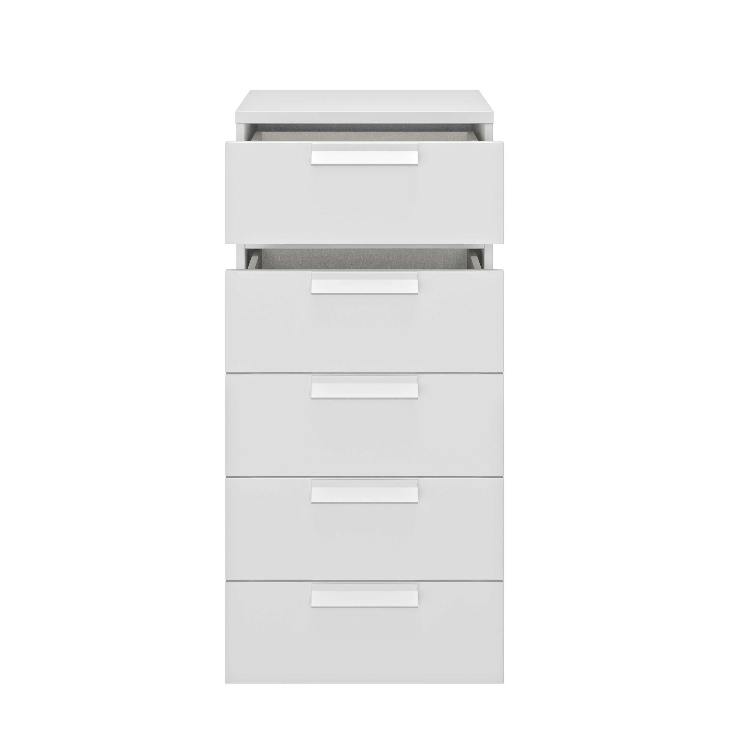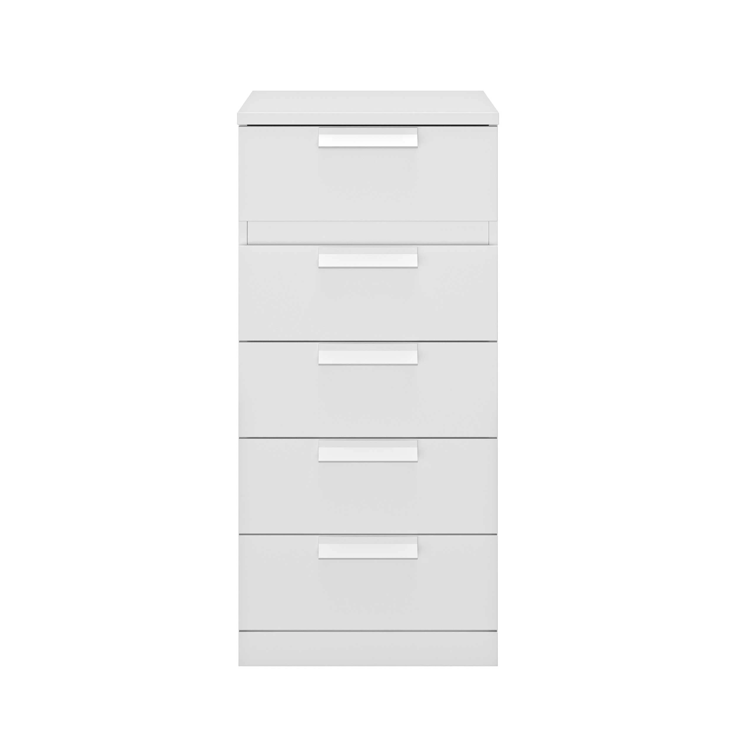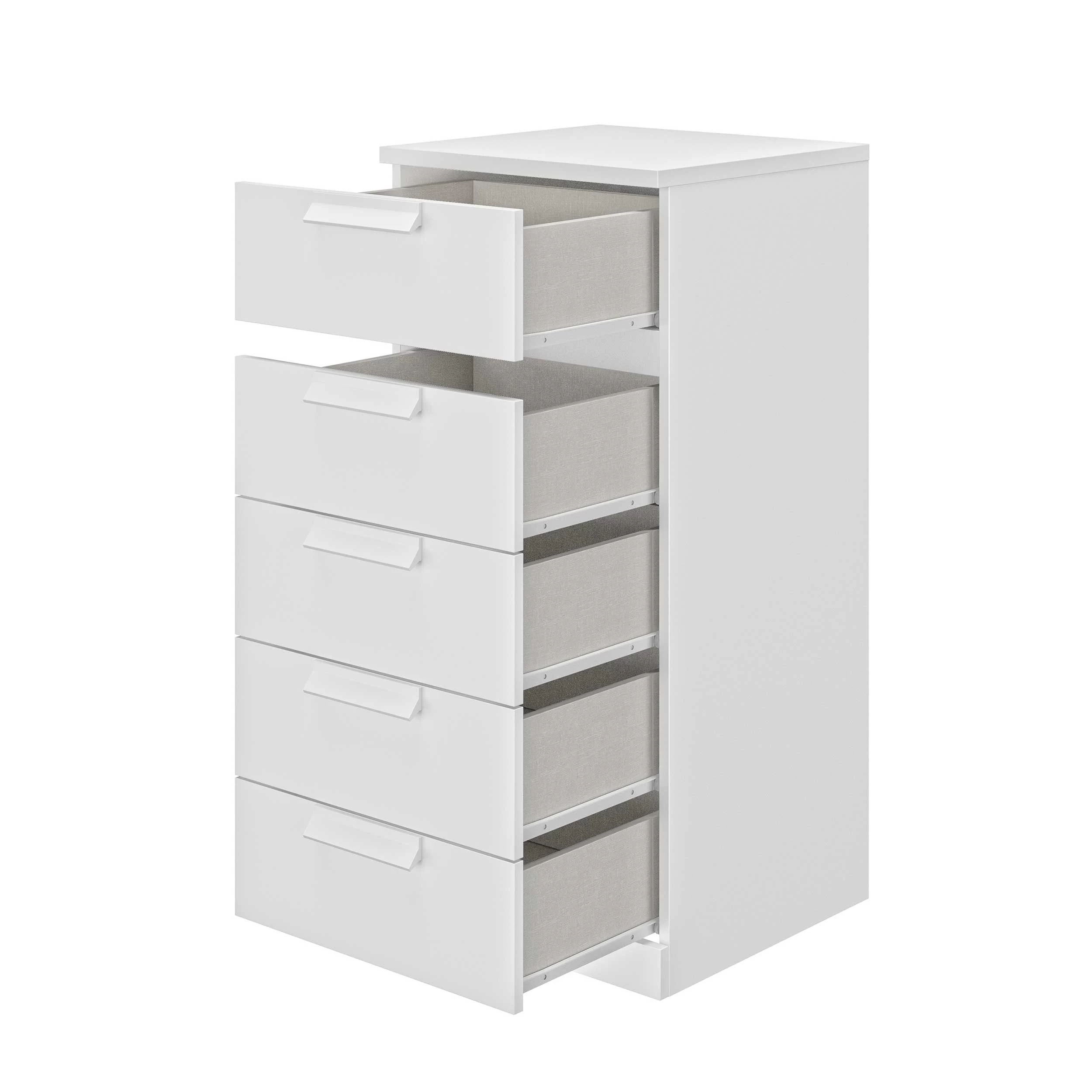 In de 5 lades van deze smalle kast kun je heel wat spullen kwijt. De kast is afgewerkt in een witte, neutrale kleur.