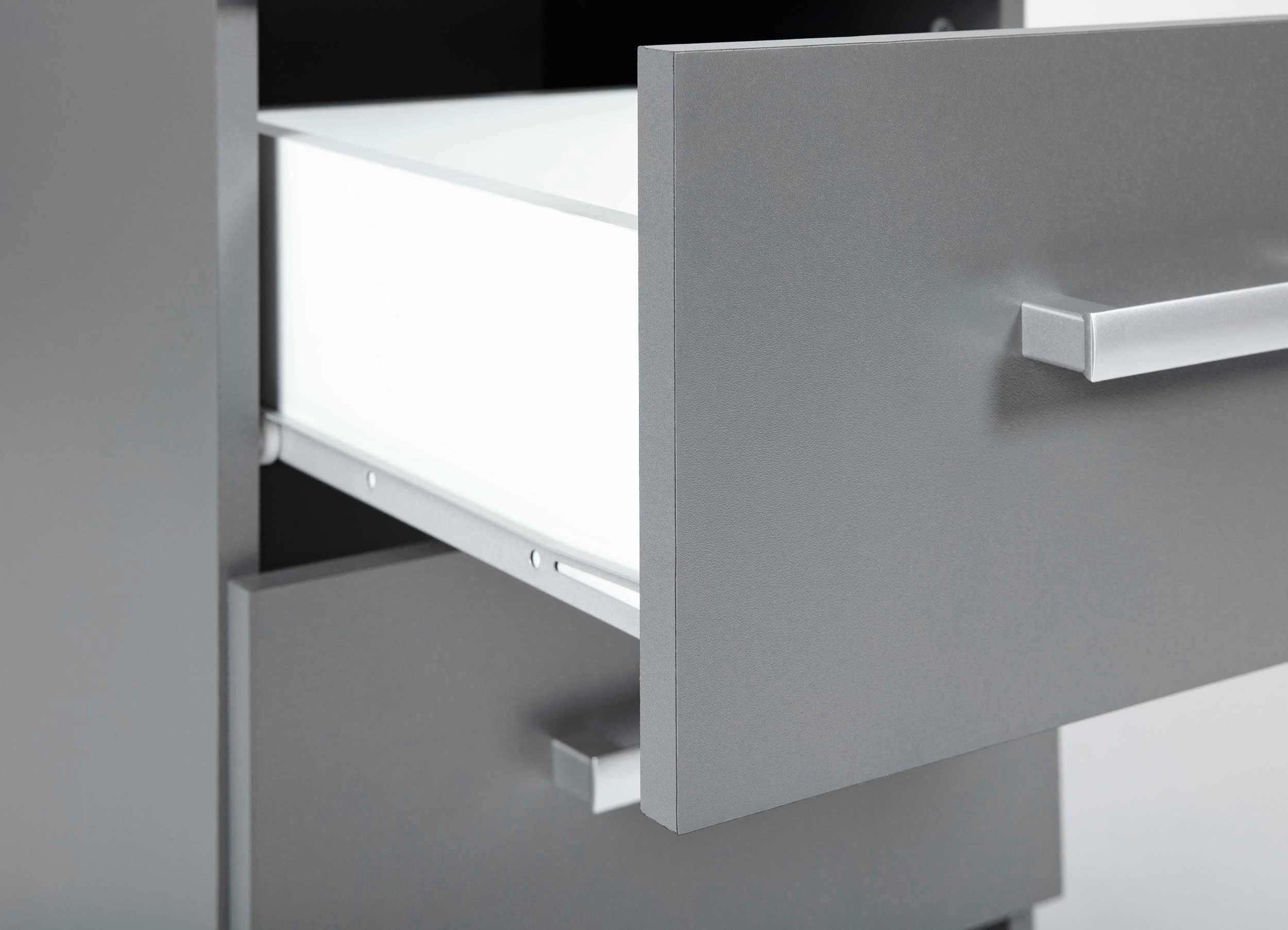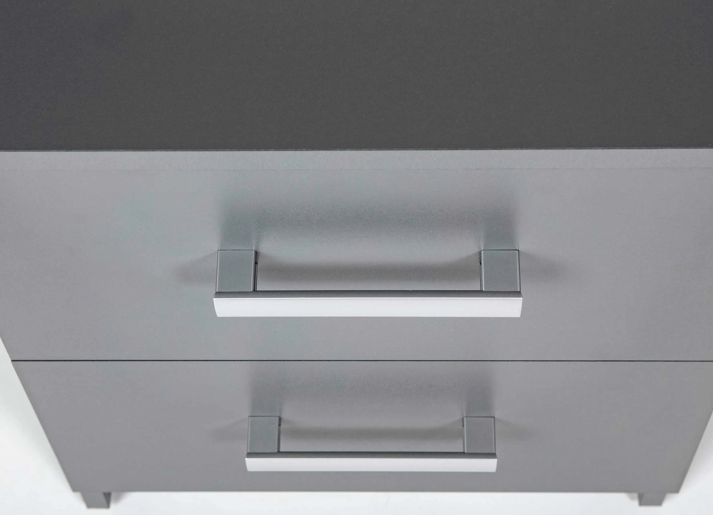 De kantoormeubelen van de Eden-collectie zijn gemaakt uit spaanplaat. Deze moderne meubelen stralen ook enige rust uit dankzij de simpele afwerking in effen grafiet grijs.
