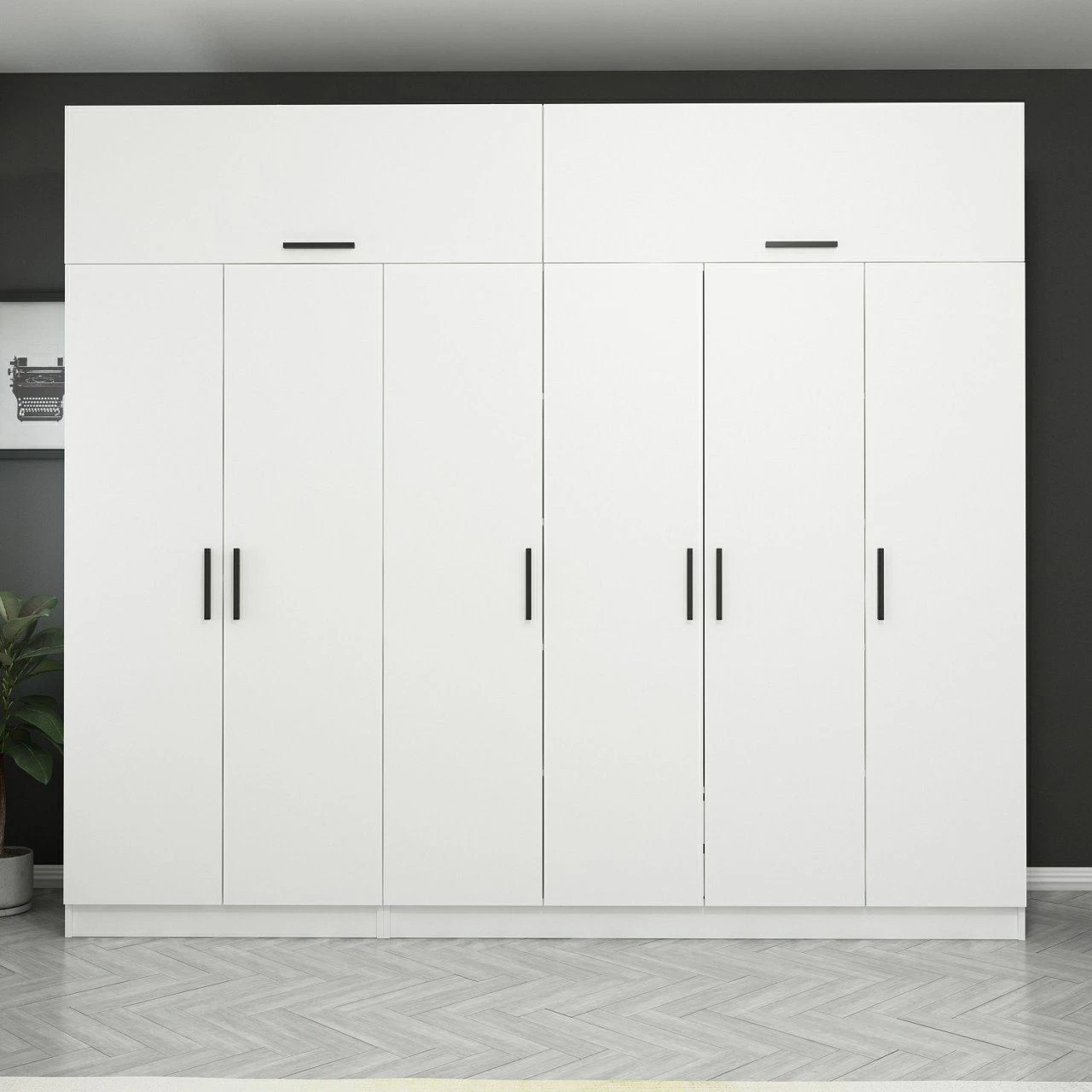 Met een breedte van 270 cm, een hoogte van 235 cm en een diepte van 52 cm biedt deze kledingkast voldoende opbergruimte voor al je kleding en accessoires. Hij is voorzien van talloze legplanken, zodat je je spullen netjes en efficiënt kunt ordenen.