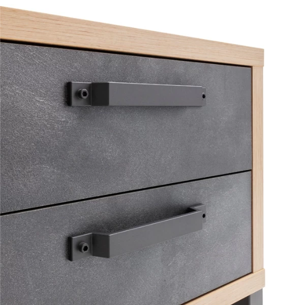 Fan van de industriële woonstijl? Dan is de reeks Faber helemaal jouw ding! Dit nachtkastje is gemaakt uit gerecycleerde spaanplaat, afgewerkt met melamine. Het warme eikdecor gaat mooi samen met de donkere betonlook voor een stoere uitstraling. De nachtkasje is handig om een leeslamp of een glas water op te plaatsen. Dankzij de twee lades kun je ook allerlei spullen netjes en discreet opbergen. De collectie Faber bevat meubels voor elke ruimte in je huis. Ontdek de volledige collectie op onze website.