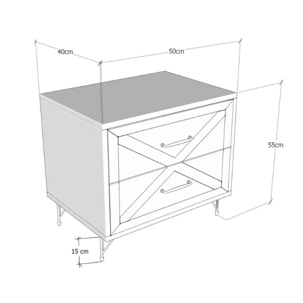 Nachtkastje Félise is gemaakt uit gemelamineerde spaanplaat en bestaat uit 2 lades met telescopische geleiders. Het kastje heeft zwarte metalen handvaten en poten.