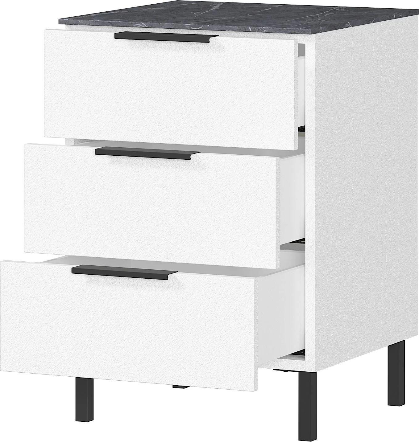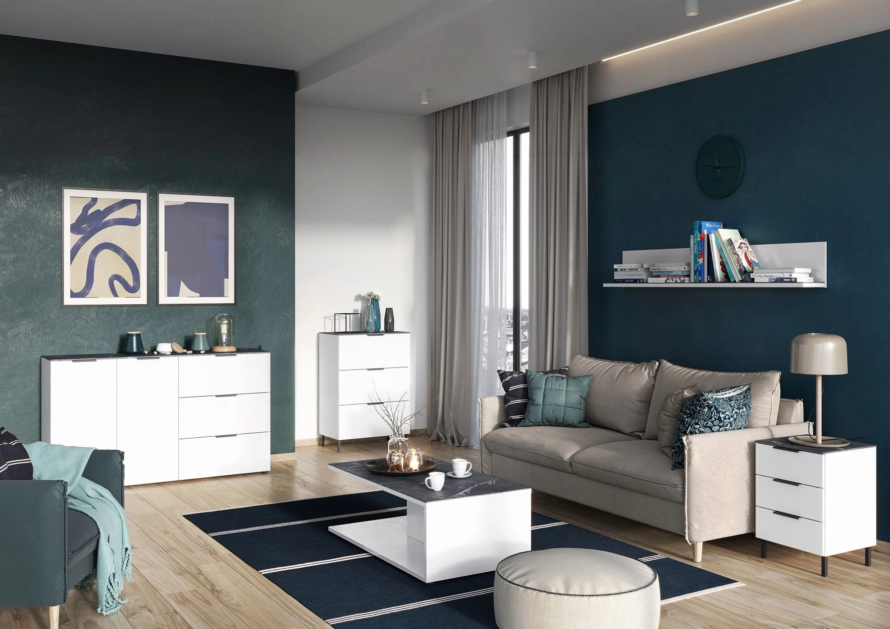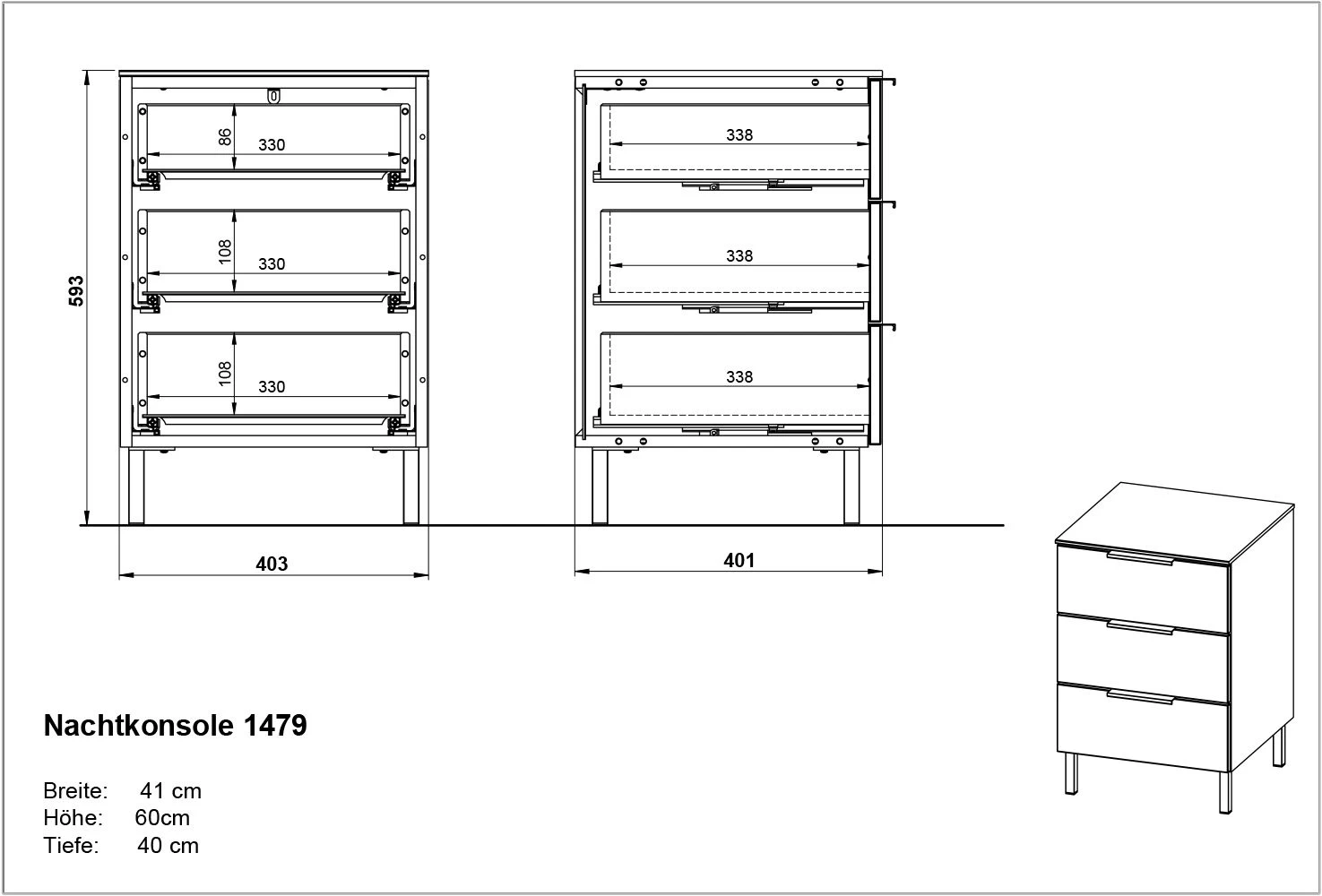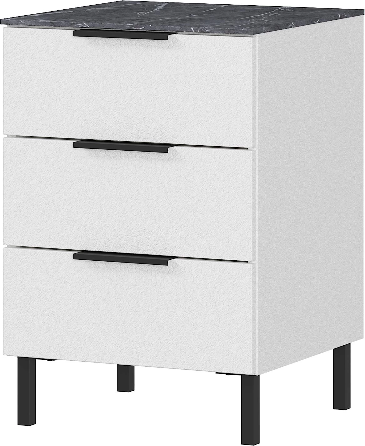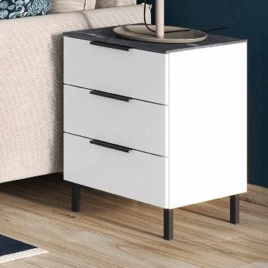 Dit meubel, dat dienst kan doen als nachtkastje of kleine ladekast, is voorzien van drie lades met softclose. Met een breedte van 41 cm, een hoogte van 60 cm (met de metalen poten) en een diepte van 40 cm biedt het compacte meubel plaats aan bijvoorbeeld tijdschriften, boeken en accessoires. Het nachtkastje kan zowel op meubelglijders als op poten gemonteerd worden. Die laatste werden gemaakt uit gepoedercoat metaal en komen uitstekend tot hun recht in combinatie met de moderne touch van de ingebouwde handgrepen.