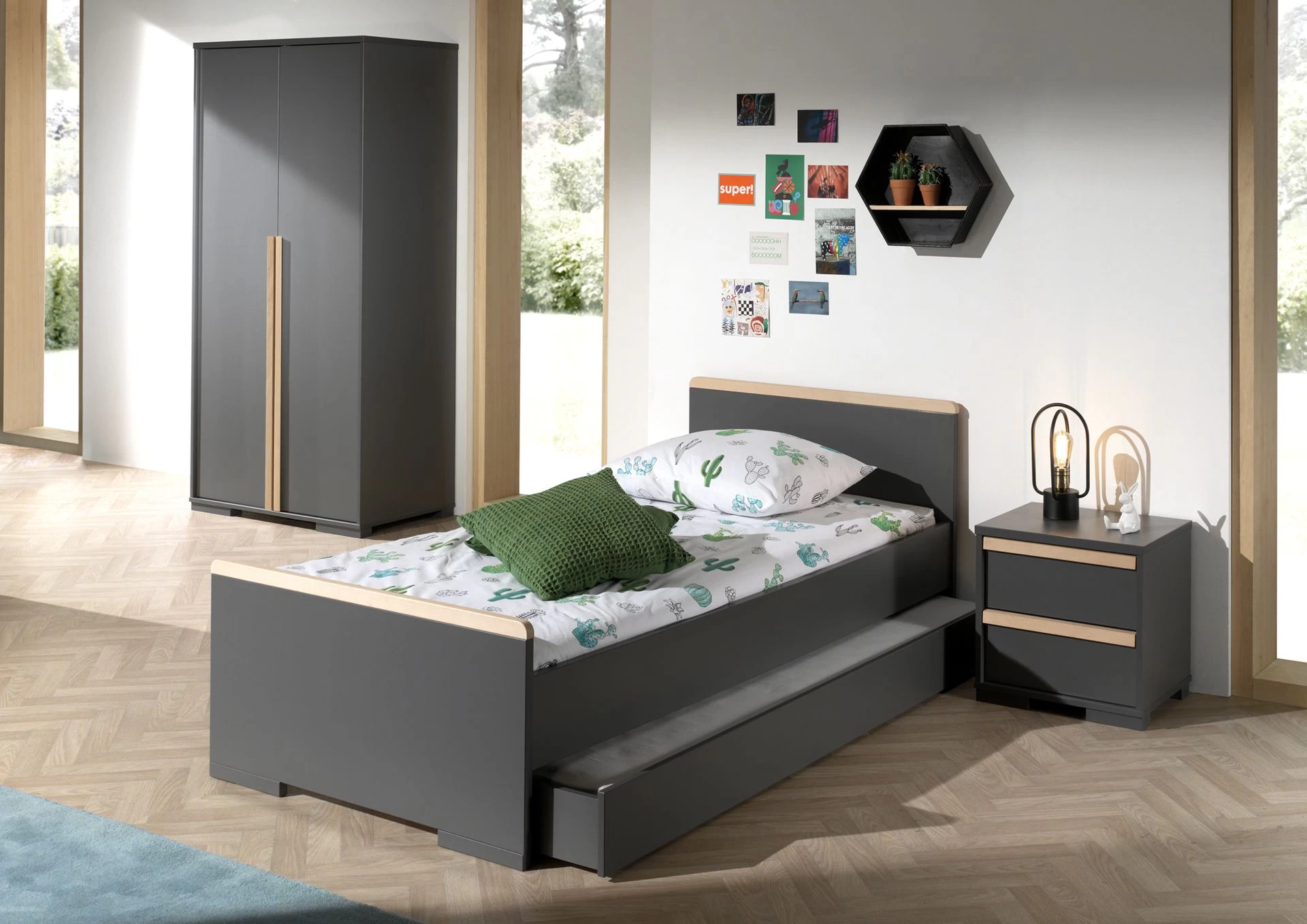 Antracietkleurig nachtkastje London met 2 lades. Gemaakt van spaanplaat.