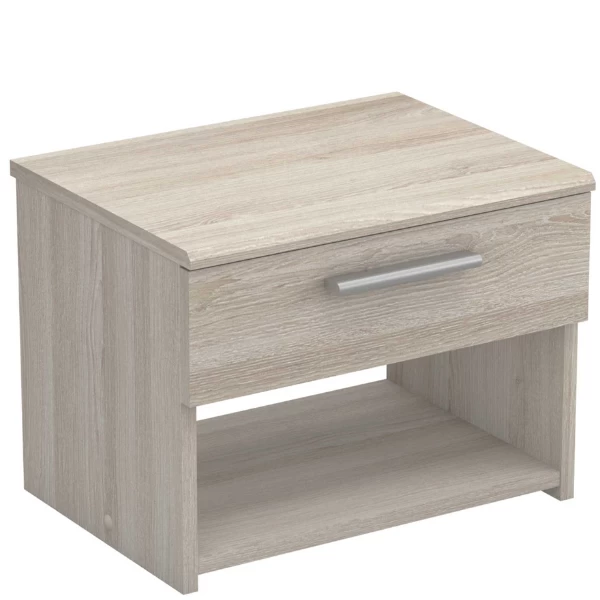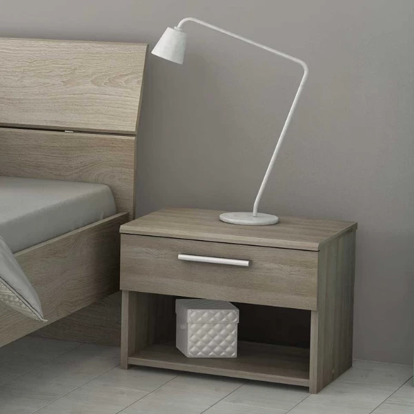 Nachtkastje Prya is gemaakt uit gemelamineerde spaanplaat met Shannon eikdecor. Het nachtkastje heeft kunststoffen handgrepen en bestaat uit 1 lade en 1 open vak.