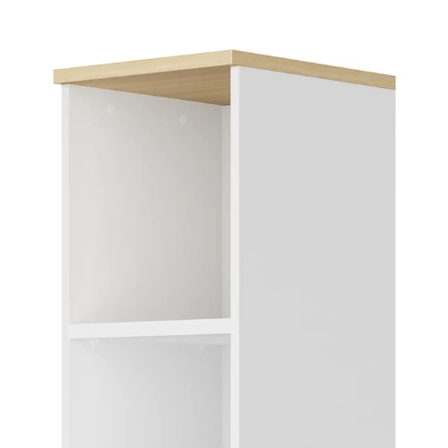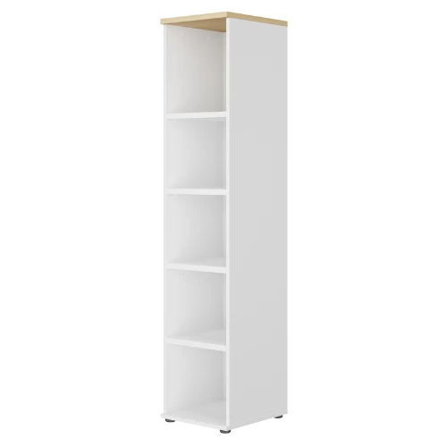 Deze praktische open kast kan je makkelijk integreren in verschillende ruimtes, afhankelijk van waar je extra opbergruimte wenst. De witte kast is gemaakt uit spaanplaat en de bovenkant is afgewerkt in een houtdecor. Dankzij de vier gelijk verdeelde legplanken kan je veel spulletjes bewaren of je mooiste decoratiestukken tonen.