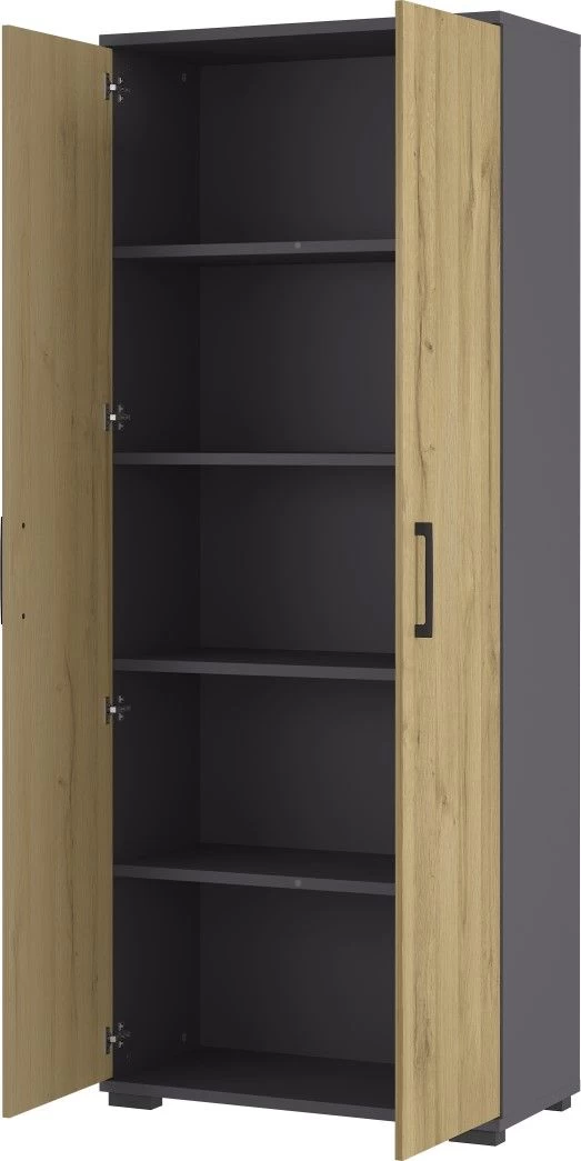 Deze opbergkast is gemaakt van spaanplaat met een laagje melamine. Het eikdecor vormt een stijlvolle combinatie met de grafietgrijze accenten en zwarte handgrepen.