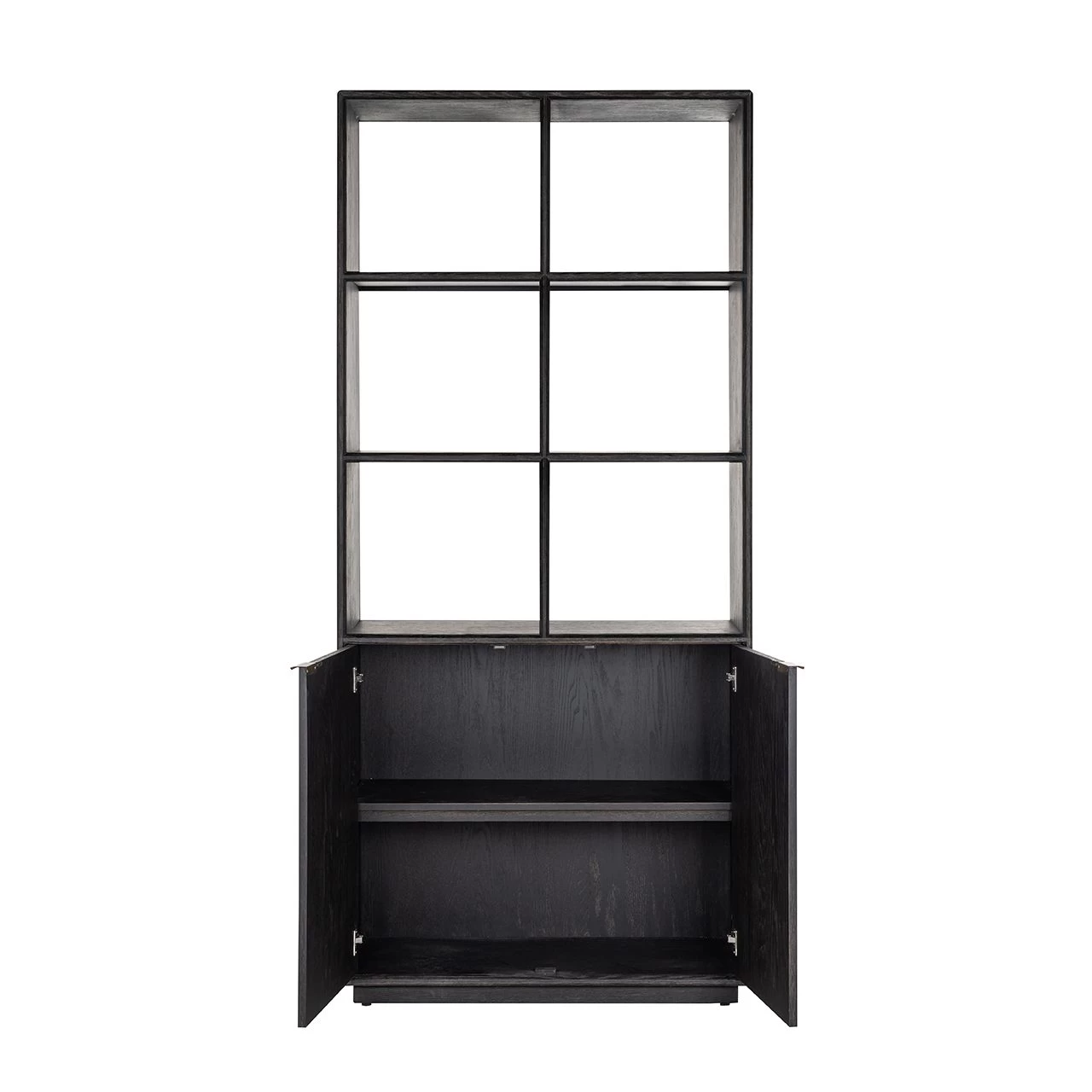 Boekenkast Bony met 2 deuren en 6 open vakken, gemaakt uit zwart eikenhout en een goudkleurig frame in metaal.Â