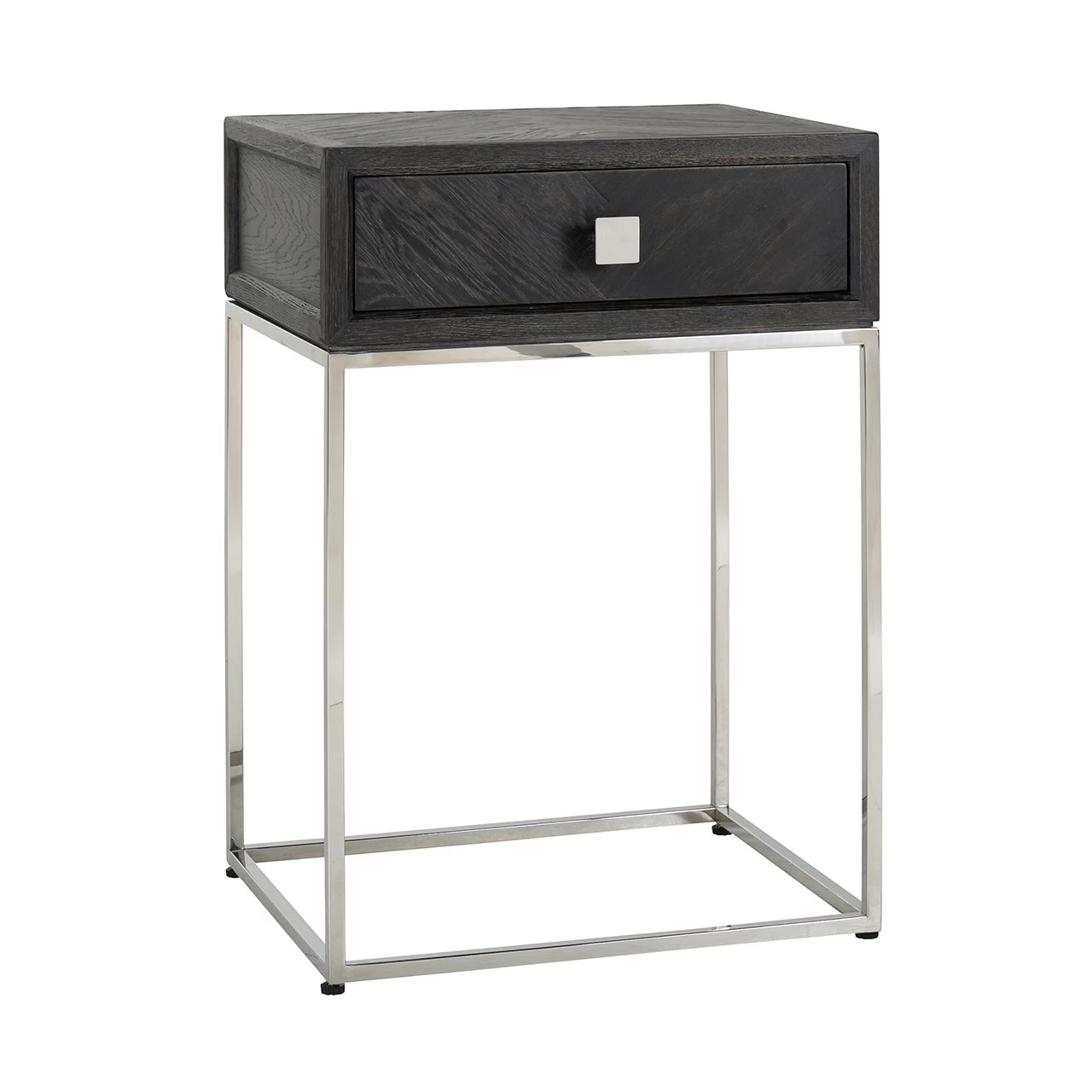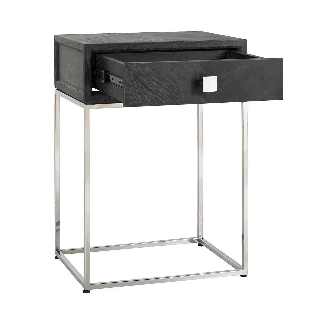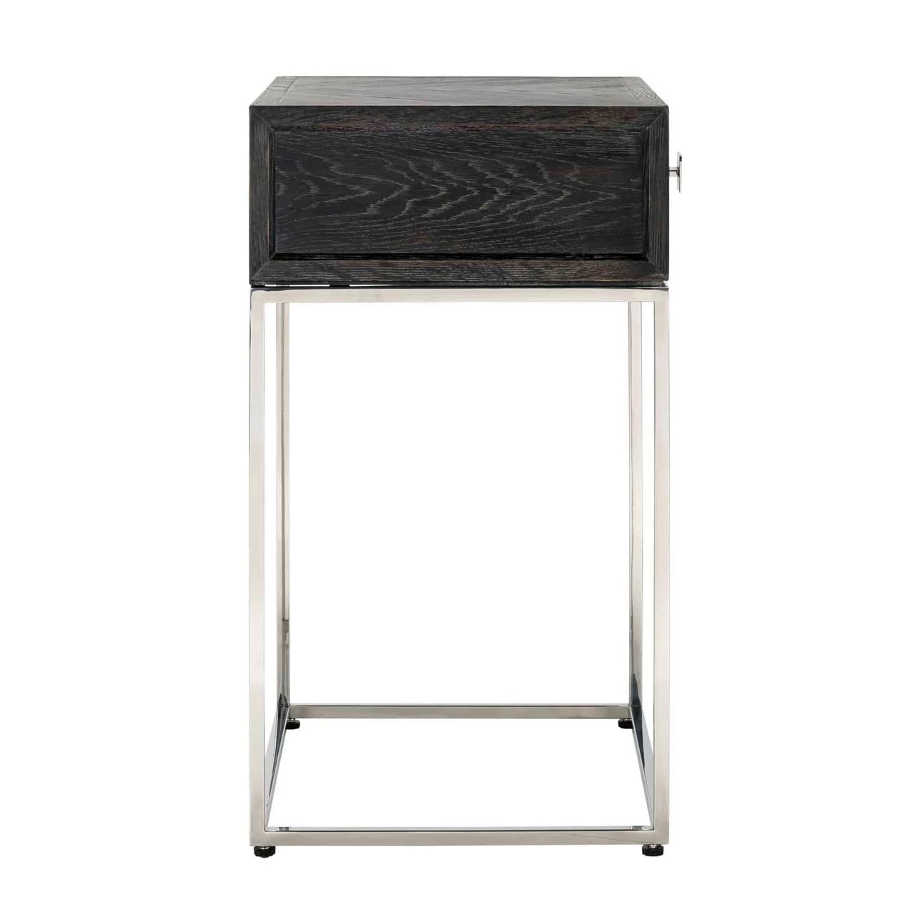 Nachtkastje Bony met 1 lade, gemaakt uit zwart eikenhout en een zilvergrijs frame in roestvrij staal.Â