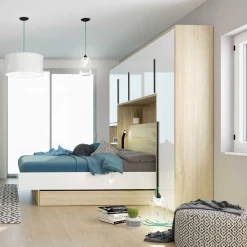 Gestoffeerd Bed Maeva 140x200cm Met Twee Nachttafeltjes – Witte Bouclé Stof