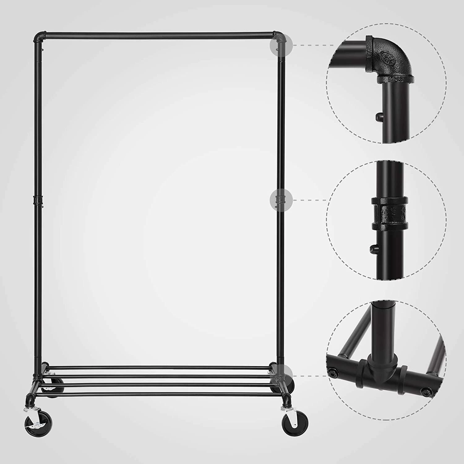 Chique industriële stijl, robuust en zwaar, gemakkelijk te verplaatsen of te laten staan, meer bereiken. Premium metalen buizen zorgen voor superieure sterkte en stabiliteit met een maximale statische belasting van 90 kg. 4 universele PP wielen en metalen bovenrail om gekreukelde blouses te organiseren. Bereik meer met dit Heavy-Duty metalen kledingrek!