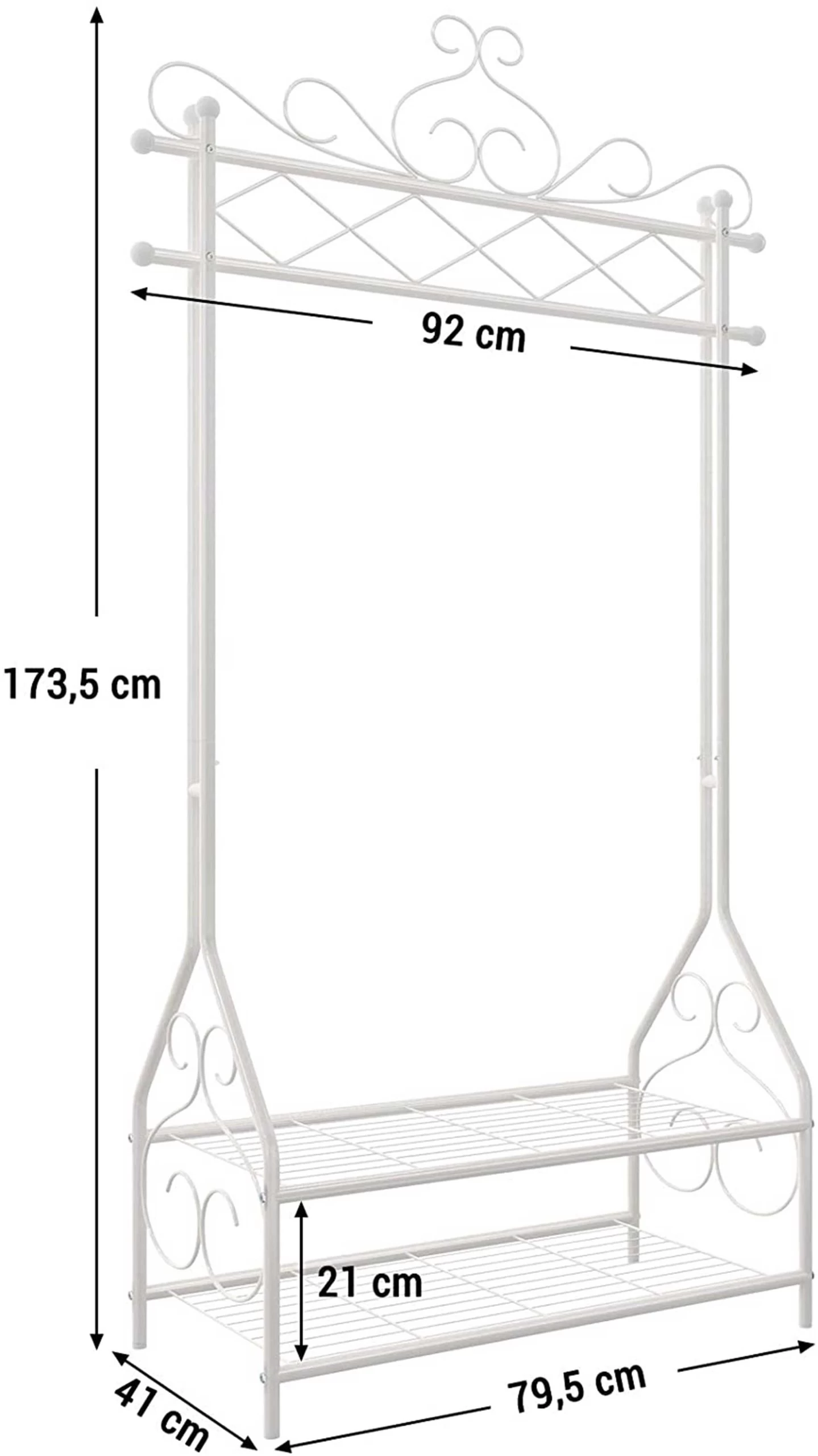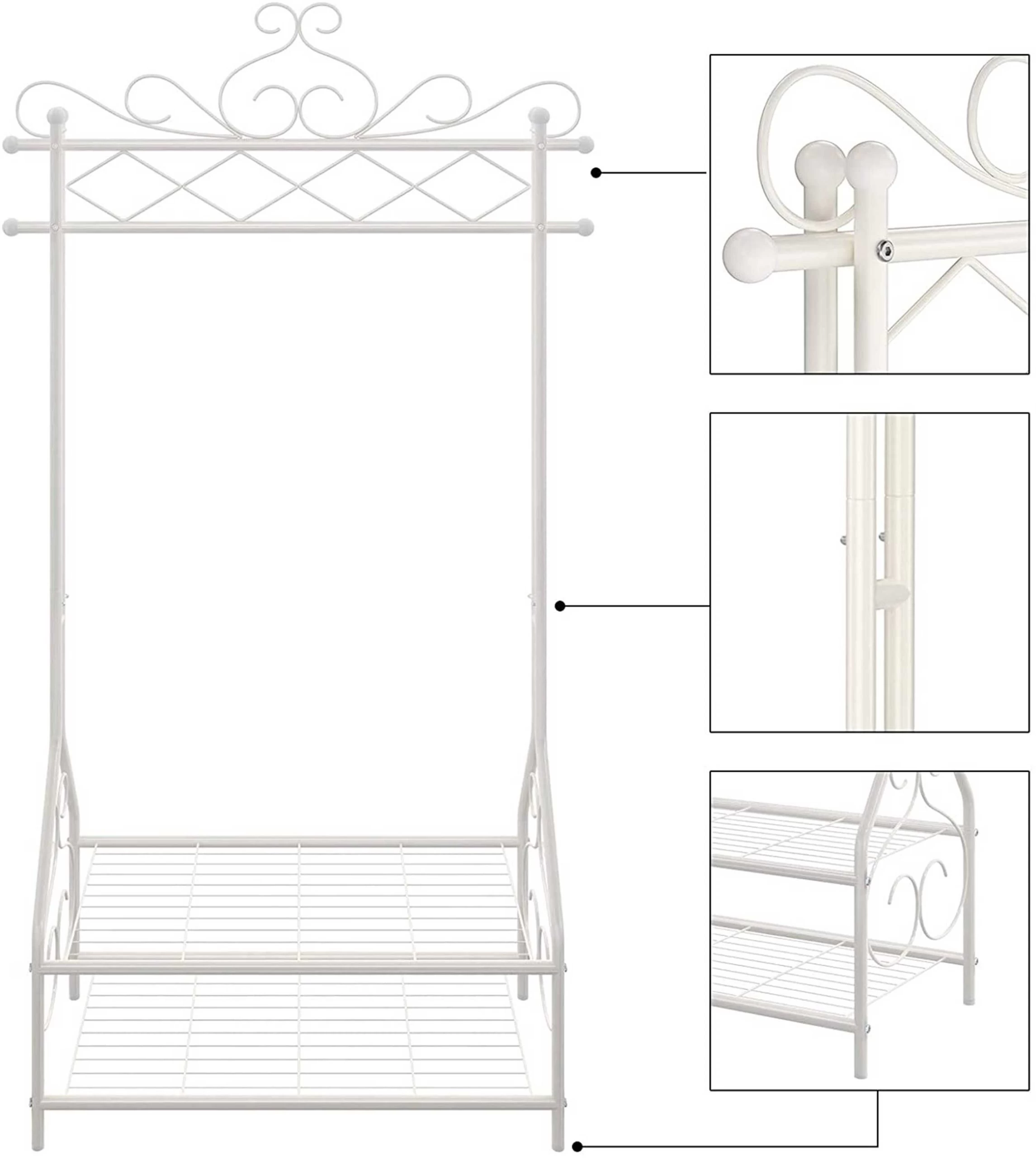 Vintage crèmekleurige kledingstandaard met kledingstang en 2 metalen planken (92 x 173 x 41 cm). Combineert opslag en decoratie in één frame – hang kleding en accessoires aan de bovenkant, berg dozen en schoenen op de grote planken op. Eenvoudige montage, stabiel met verstelbare poten en een hoog draagvermogen van 25 kg (hangrail) en 10 kg (planken). Perfect voor hal, kleedkamer, slaapkamer
