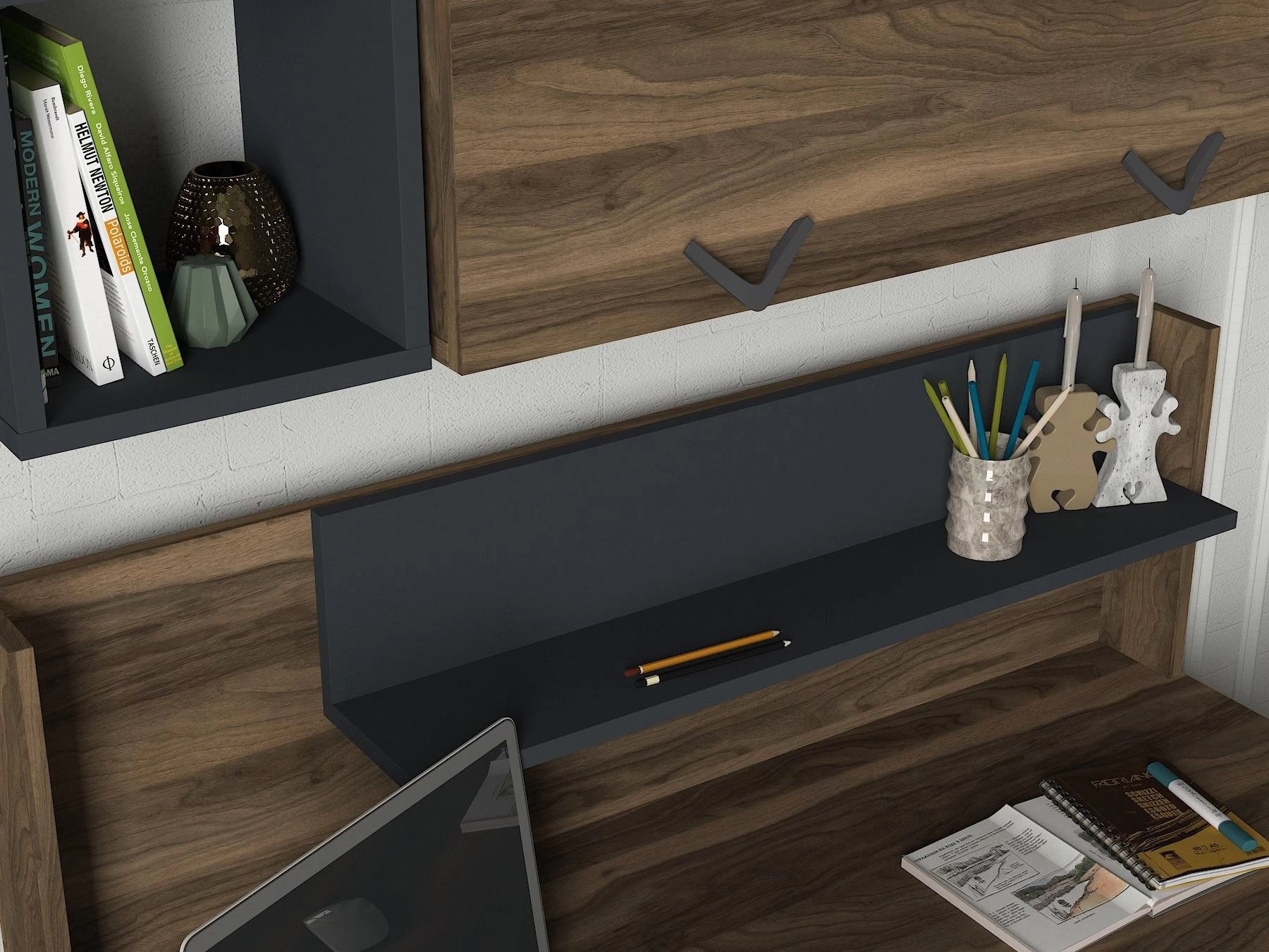 Het Study Desk is uitgerust met een bovenste plank die extra opbergruimte biedt voor boeken, notitieblokken, schrijfgerei of decoratieve voorwerpen. Met een breedte van 89 cm biedt deze plank een handige plek om je benodigdheden binnen handbereik te houden terwijl je werkruimte opgeruimd blijft. De bovenste plank is ontworpen in een walnoot antraciet kleur en voegt een vleugje elegantie en verfijning toe aan je studeerruimte.