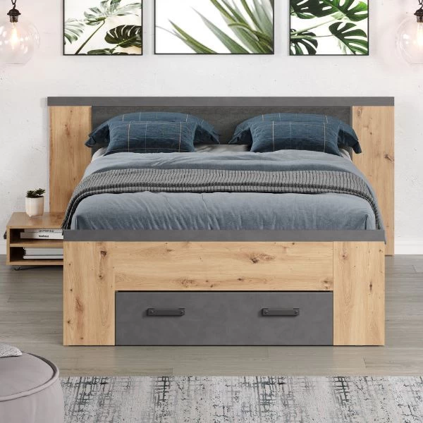 Dit bed is uitgerust met twee bijpassende nachtkastjes, drie uitschuifbare lades en vier open opbergvakken. Hierdoor heb je alles wat je nodig hebt binnen handbereik, of het nu gaat om boeken, kleding of andere persoonlijke bezittingen.
