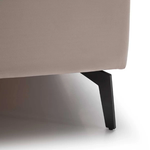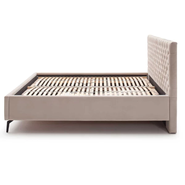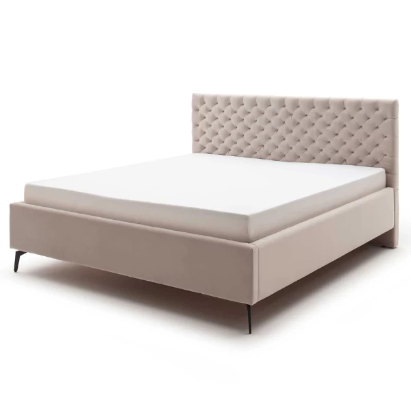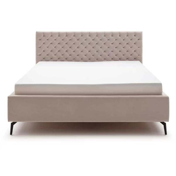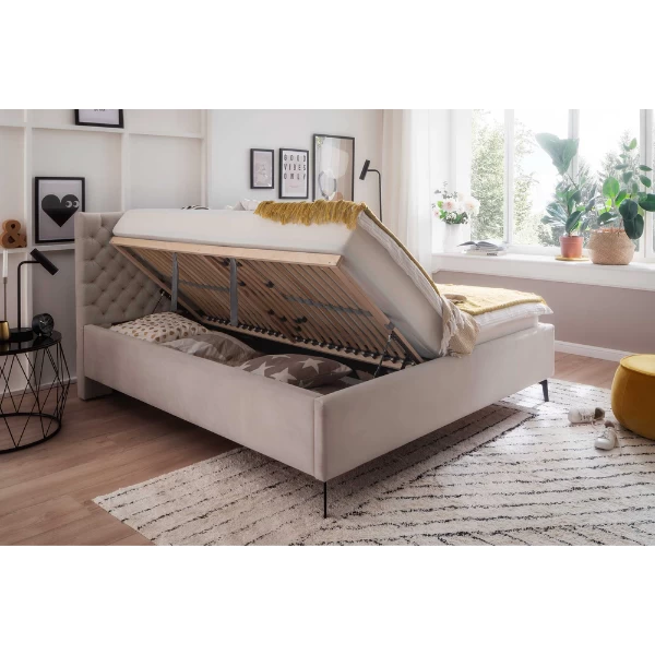 Tweepersoonsbed Janice met zwarte pootjes en bekleed met beige velours. Met opbergruimte onder de lattenbodem. Geschikt voor een matras van 180x200cm; matras niet inbegrepen.