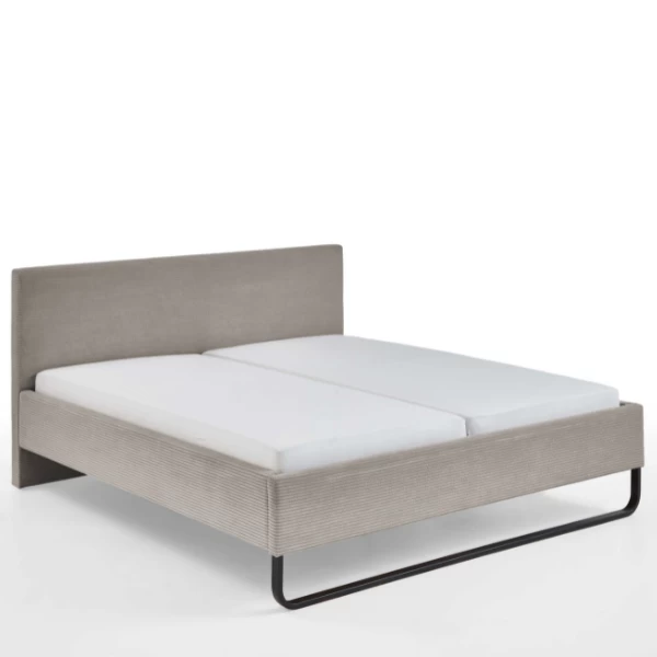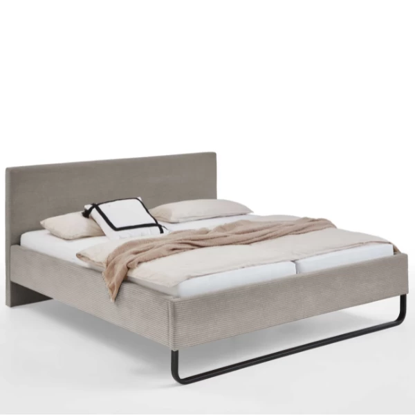 Tweepersoonsbed Velma 217x191x100cm uit spaanplaat met bekleding in taupekleurig ribfluweel en zwarte metalen voet. Geschikt voor matras en lattenbodem van 180x200cm, beide niet inbegrepen.