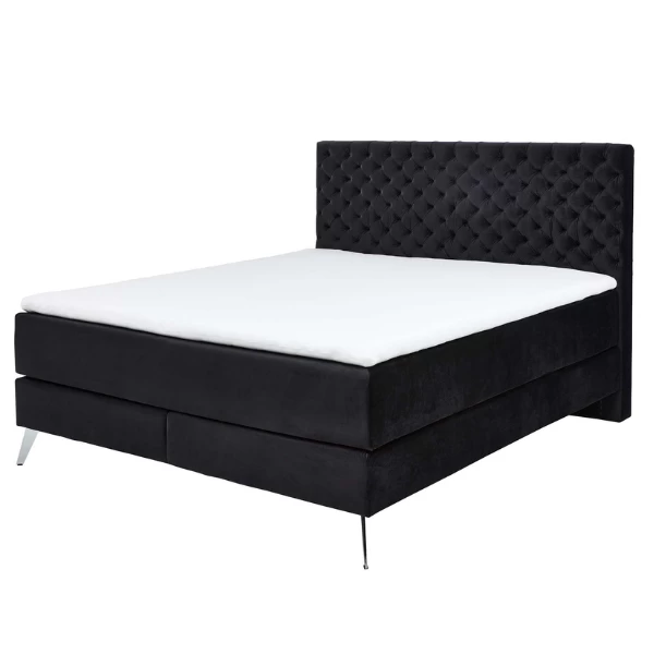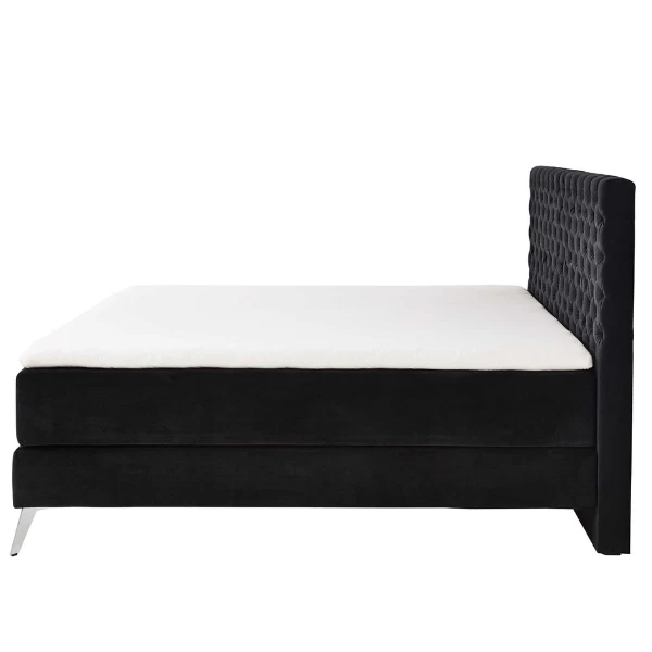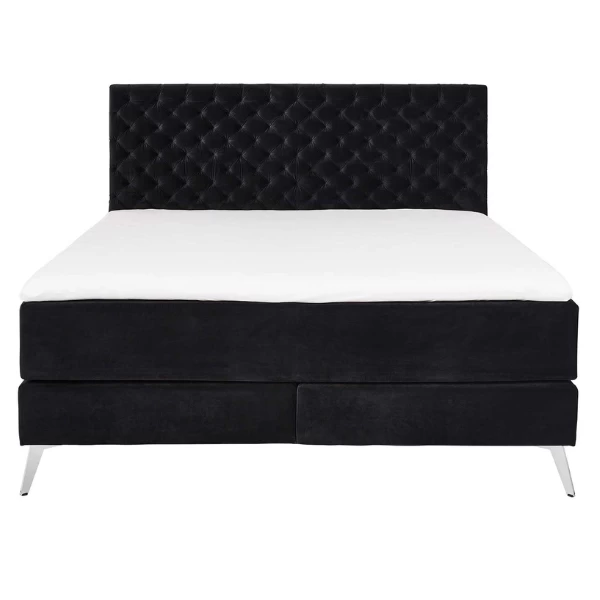 Boxspringbed Janice 211x162x130cm met chroomkleurige pootjes en bekleed met zwart velours. Voorzien van een pocketveringmatras 160x200cm.