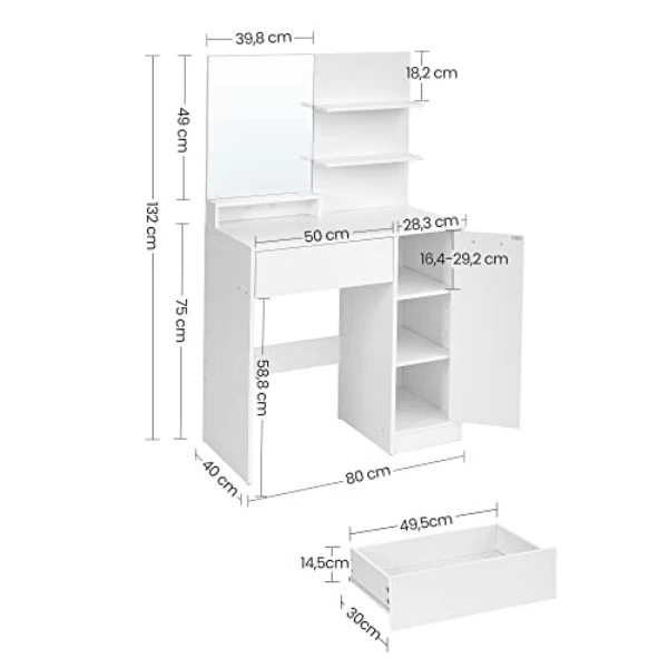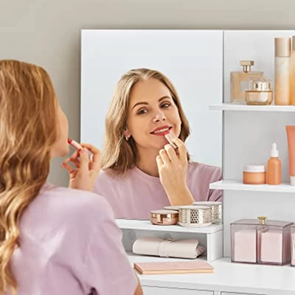 Goed begin van de dag: Begin je dag beter met deze mooie kaptafel, met opbergkast, 2 planken, 1 lade en een frameloze spiegel. Zet hem gemakkelijk in elkaar en organiseer al je cosmetica voor een mooie routine.